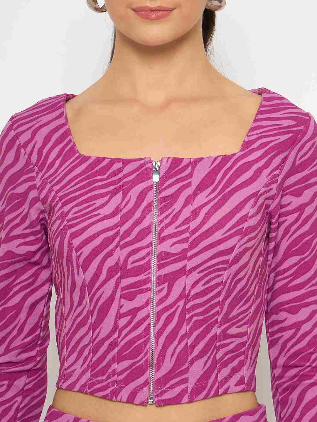 Madame Animal Print Zipped Top and Flared Bottom Pink Co-Ord Set