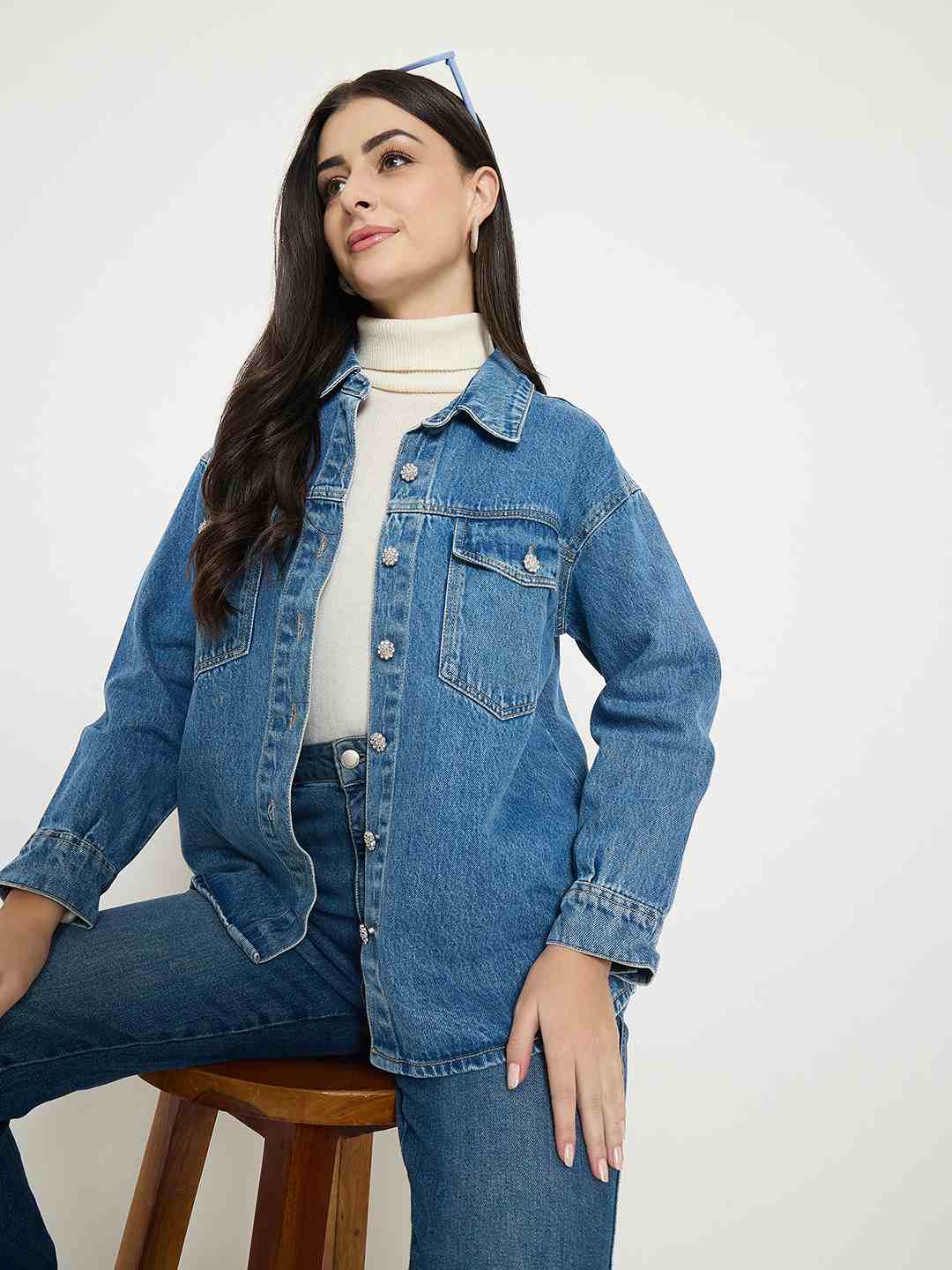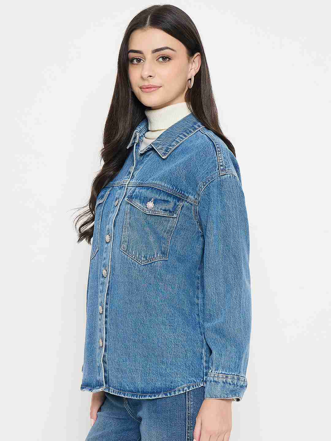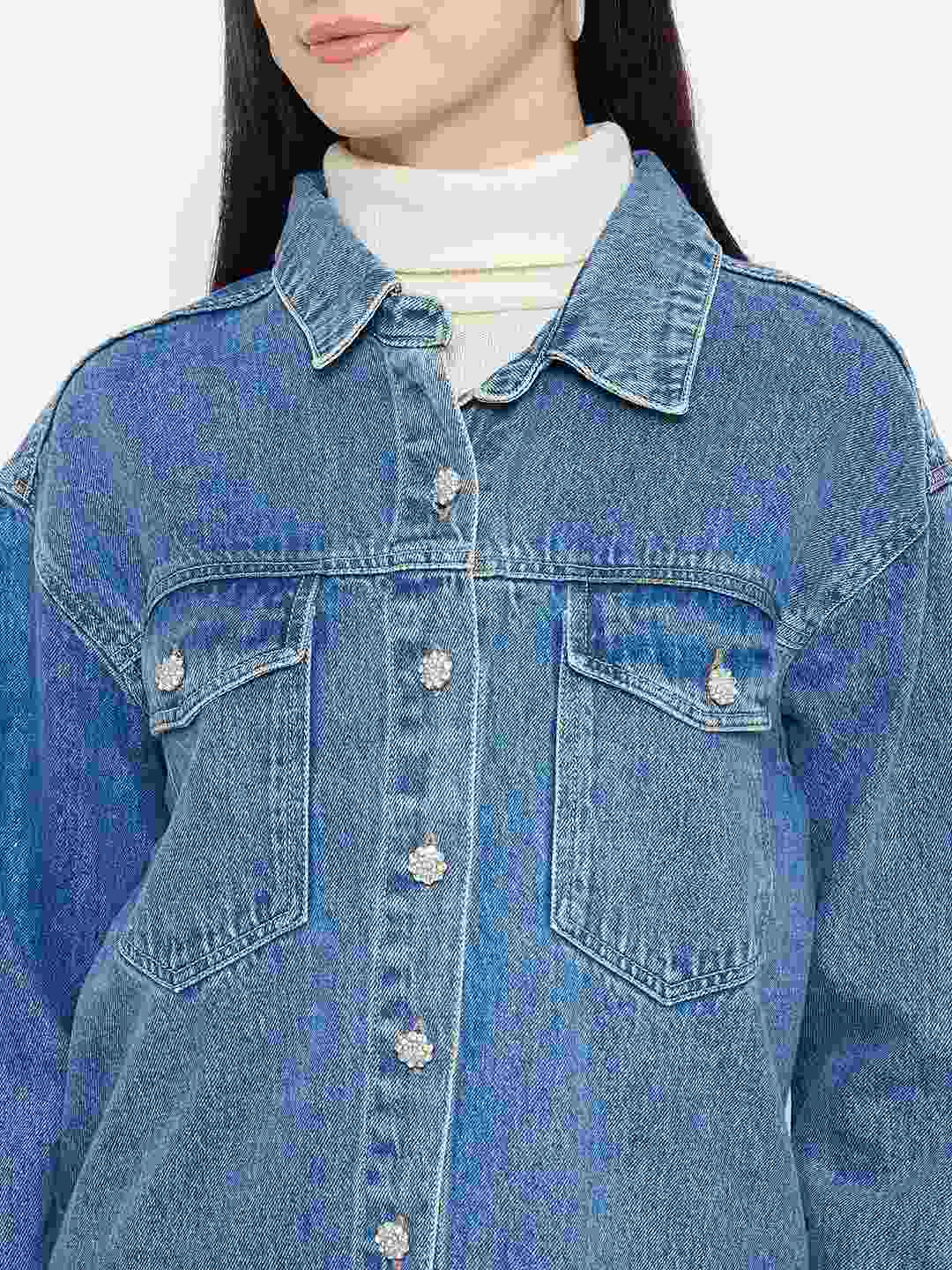 In a soft light wash, this denim jacket is perfect for casual strolls and winter mornings. It's a button up beauty that features beautiful embellished accents while keeping you on the top of the trend charts.