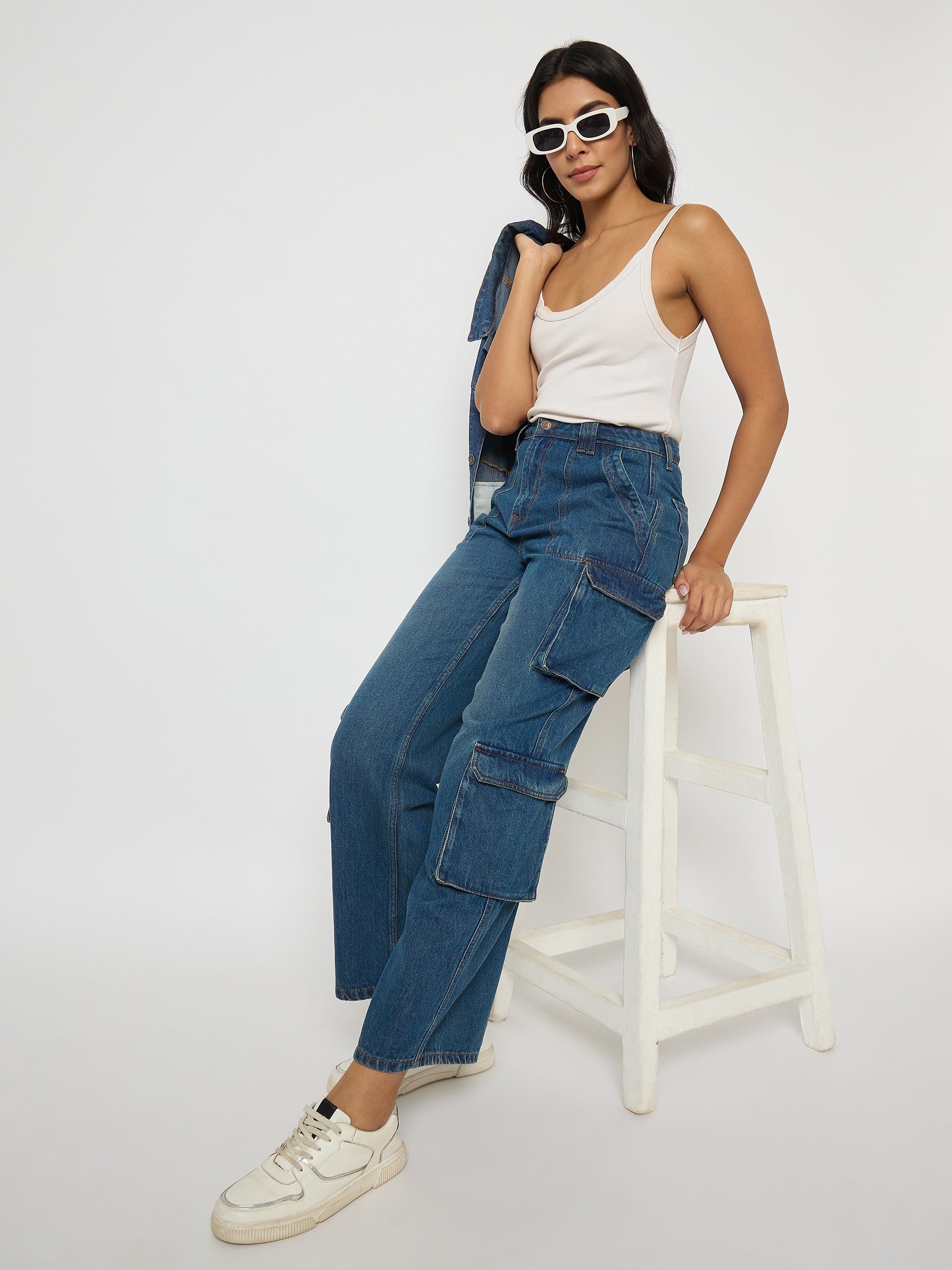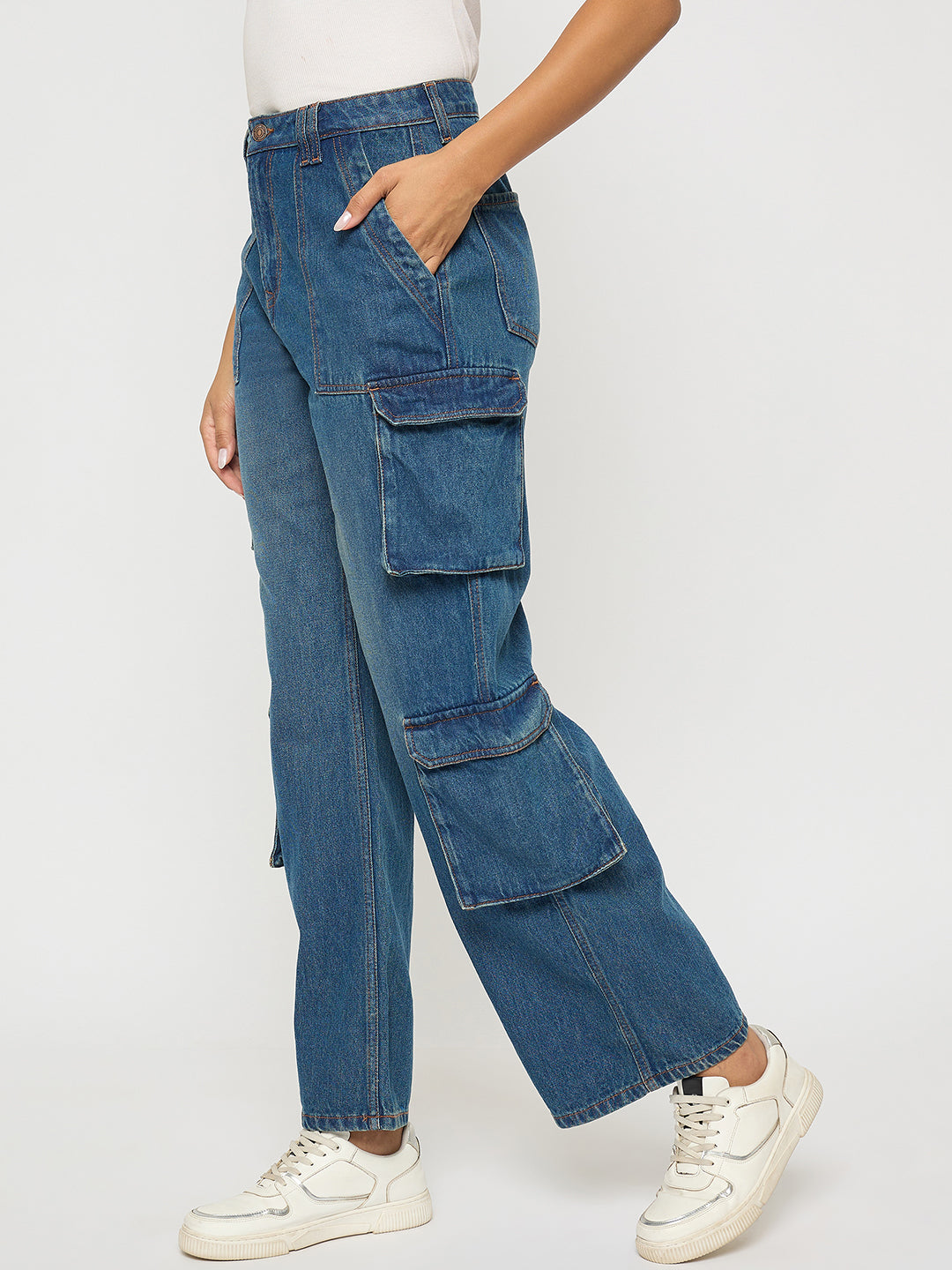 Madame Multi Pocketed Mid Blue Cotton Denim Cargo