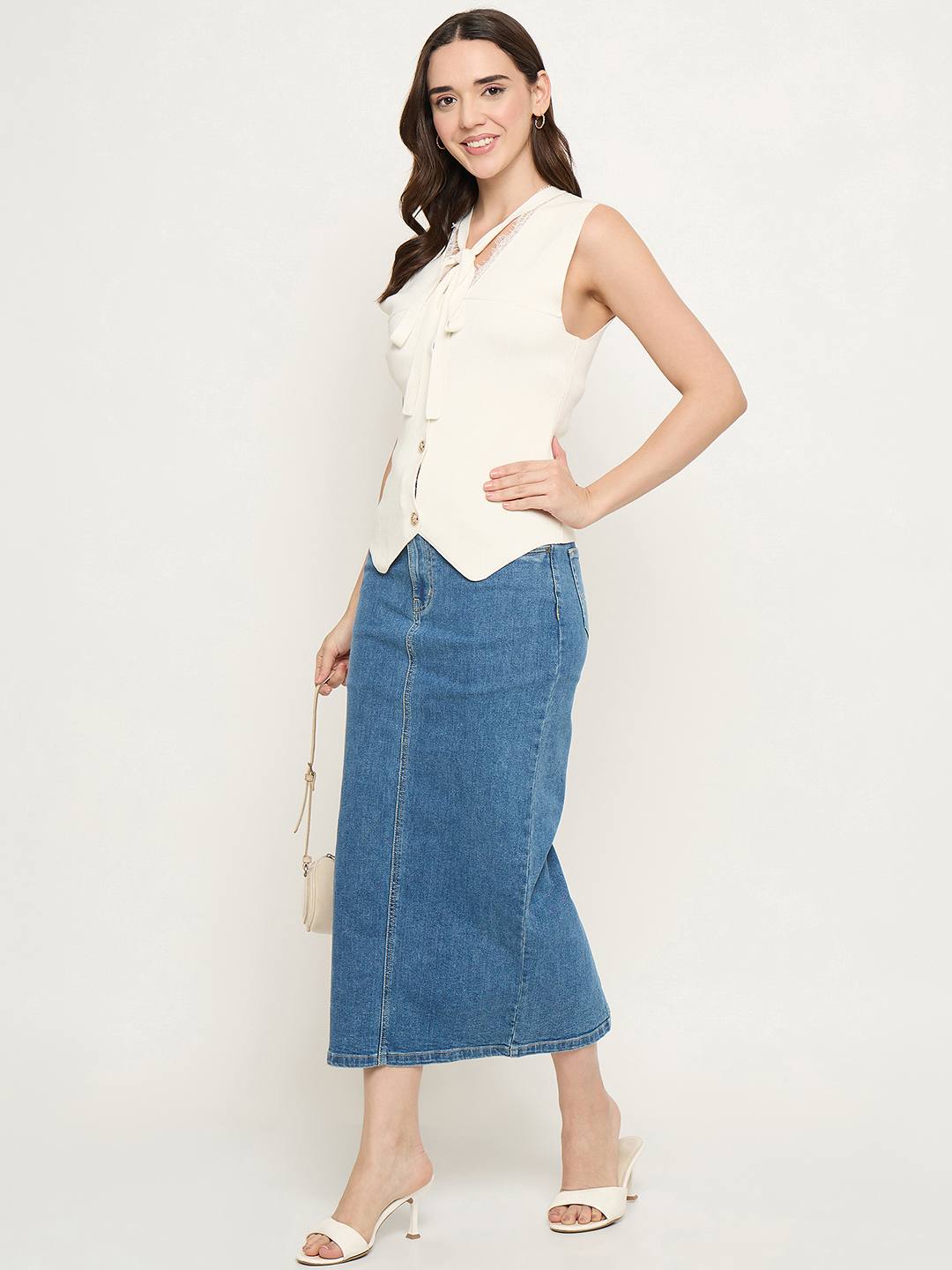 Madame Light Blue Denim Pencil Skirt hugs your curves with a flattering pencil shape and a fresh light-wash finish. Perfect for brunches, casual outings, or office days — pair it with crop tops, shirts, or tucked-in tees for a cute, trendy vibe.