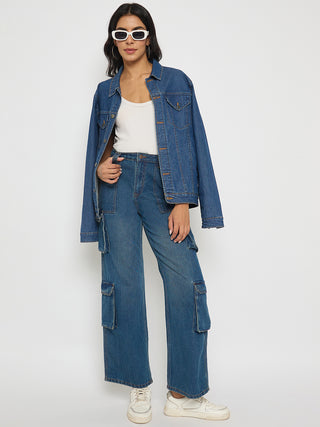 Madame Multi Pocketed Mid Blue Cotton Denim Cargo