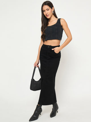 Madame Solid Jet Black Cotton Blend Maxi Denim Skirt