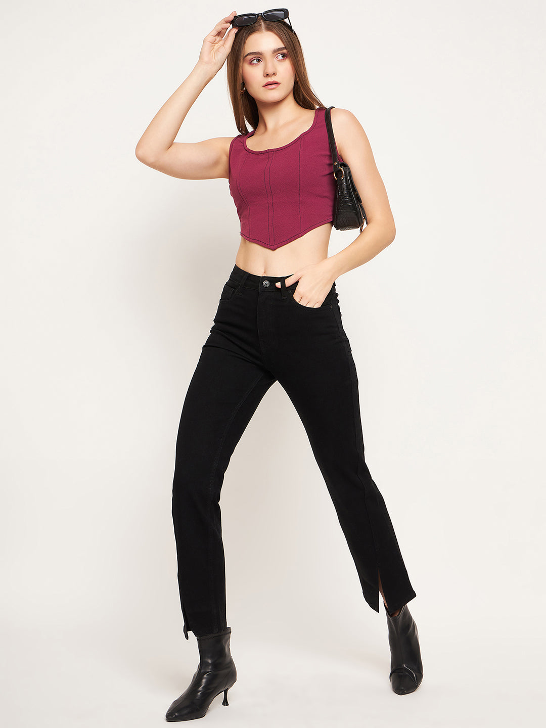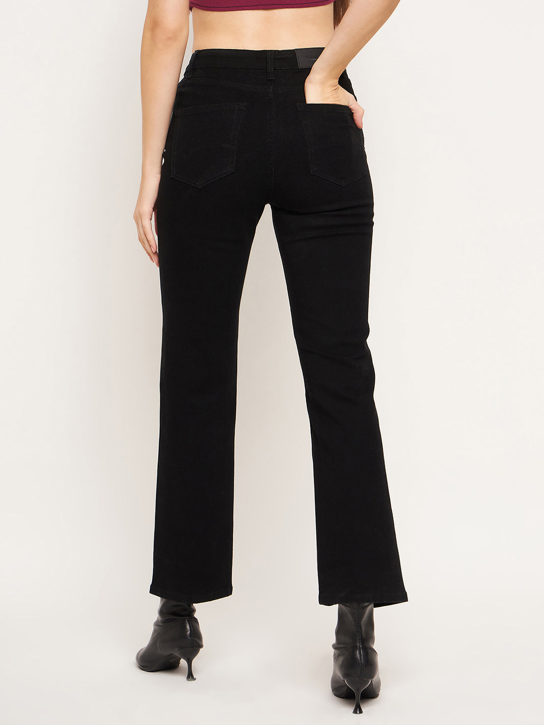 Step out in confidence wearing Madame Front Slit High-Rise Straight Black Jeans.