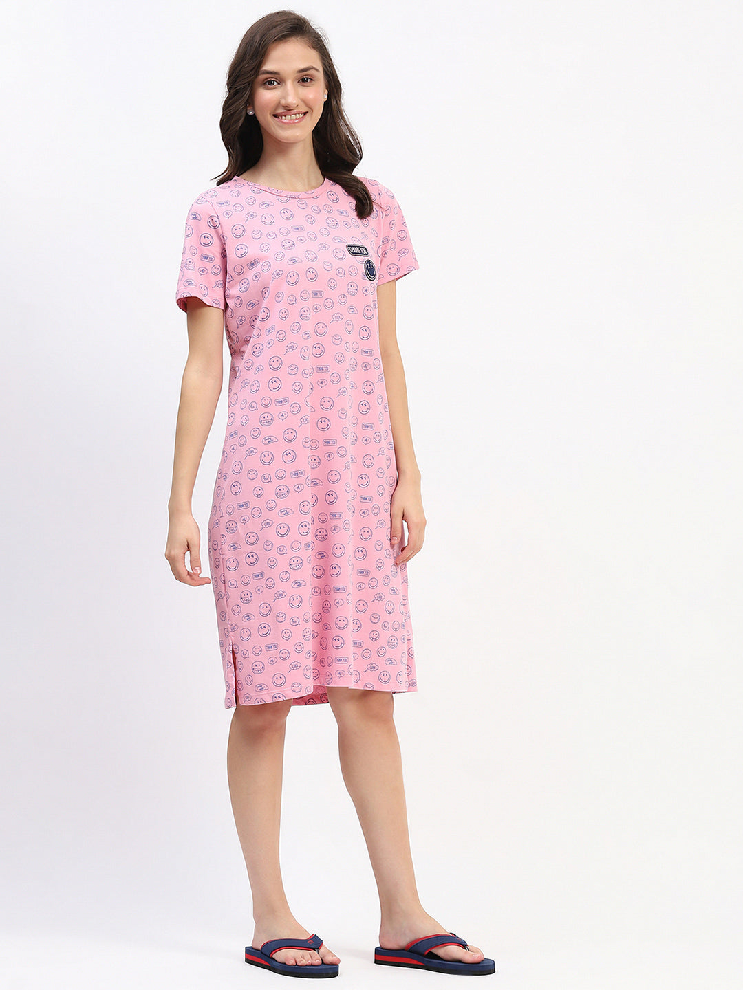 Embrace comfort and playfulness with this adorable women's nightdress, featuring an all-over smiley face print in navy blue on a soft pink background. Made from breathable and lightweight cotton, this nightdress ensures a cozy and cool feel throughout the night. The design includes a classic crew neckline and short sleeves, offering a relaxed fit that's perfect for unwinding at home. The knee-length cut is enhanced with small side slits at the hem, providing ease of movement and a casual, laid-back vibe. A small, cute patch with text adds a charming detail to the upper chest area, complementing the overall fun and youthful aesthetic. Ideal for everyday lounging or as a thoughtful gift, this nightdress combines style, comfort, and a touch of whimsy.