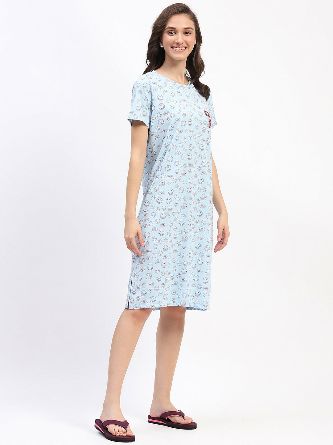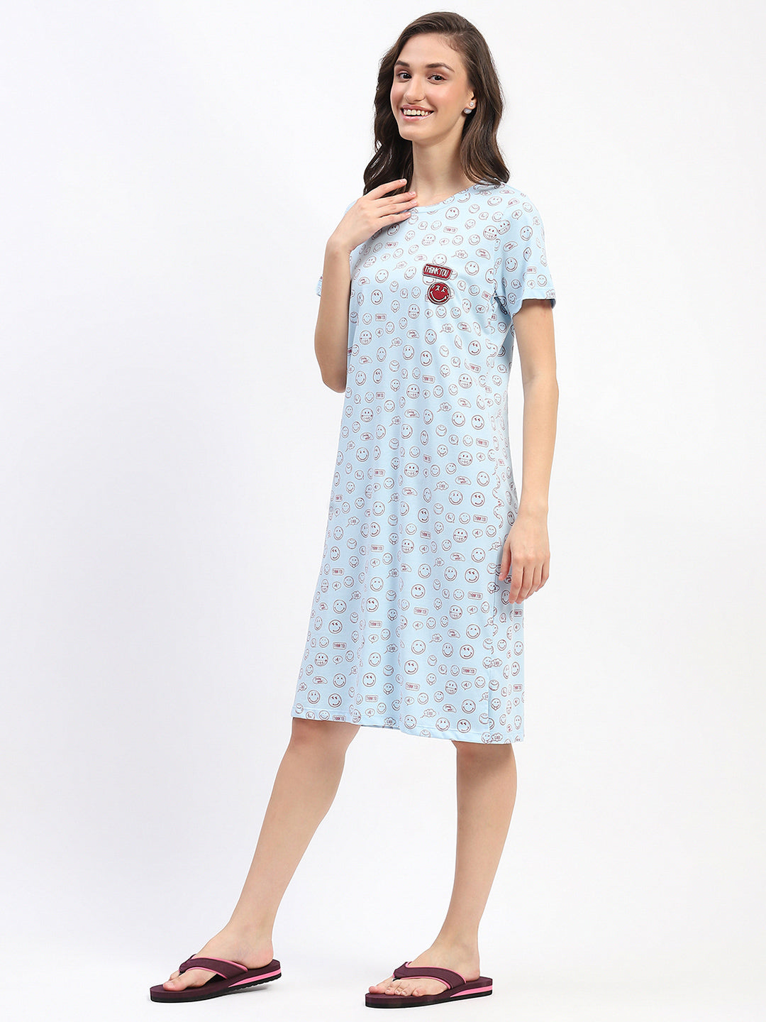 Embrace comfort and style with this charming sky blue short-sleeve nightdress. Featuring an all-over playful smiley face print, this knee-length nightdress adds a touch of fun to your bedtime routine. Crafted from a soft and breathable fabric, it ensures a cozy night's sleep. The nightdress has a relaxed fit with a round neckline and short sleeves, providing ease of movement. A small, red-themed embroidered patch with text detail adds a subtle accent to the chest area, enhancing the overall look. The hemline includes small side slits for added comfort and a casual flair. Perfect for lounging or sleeping, this nightdress combines comfort and cute design in one delightful package.
