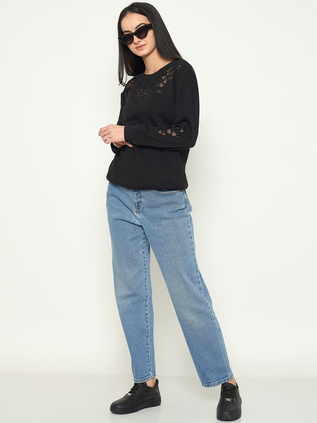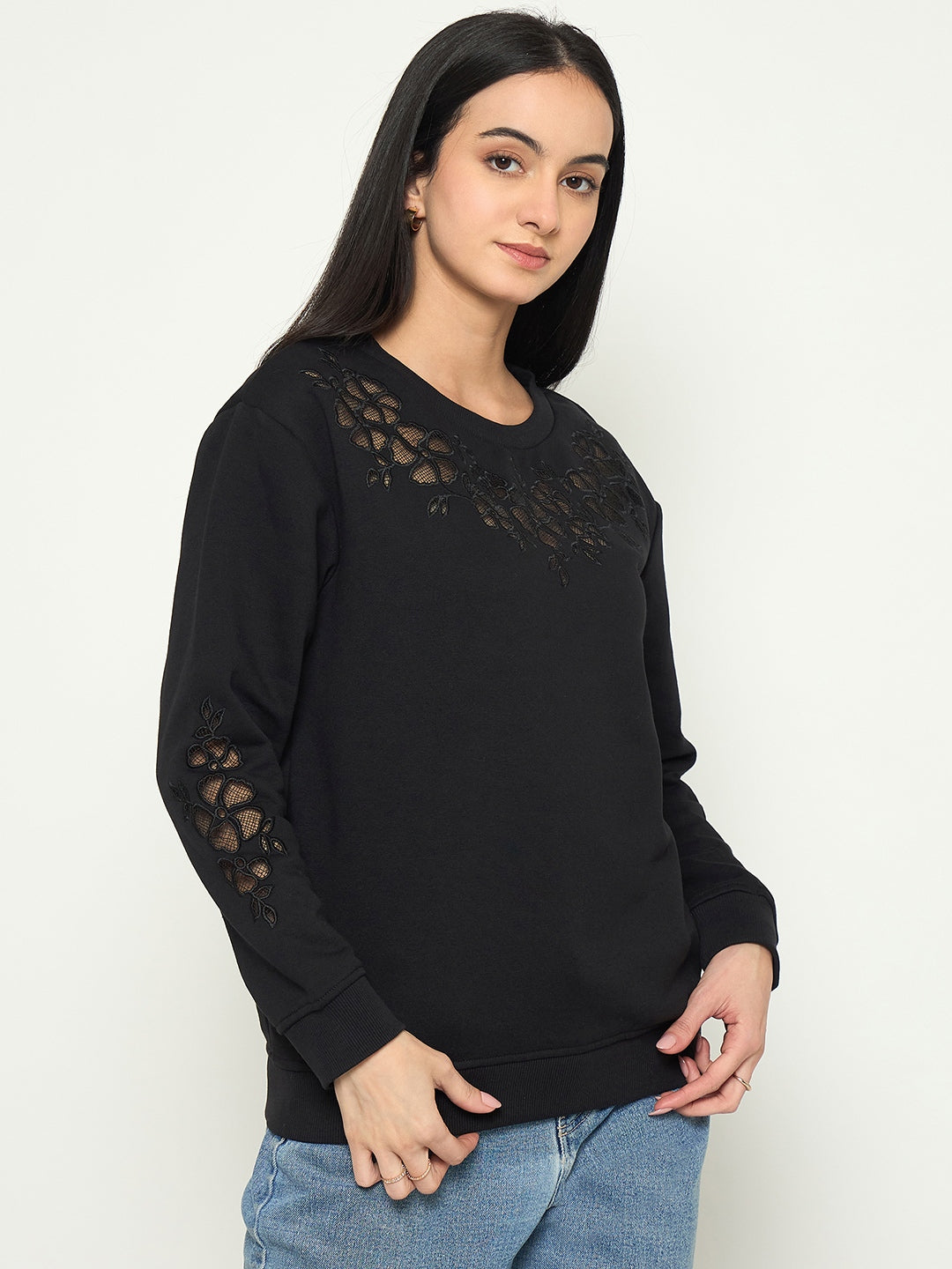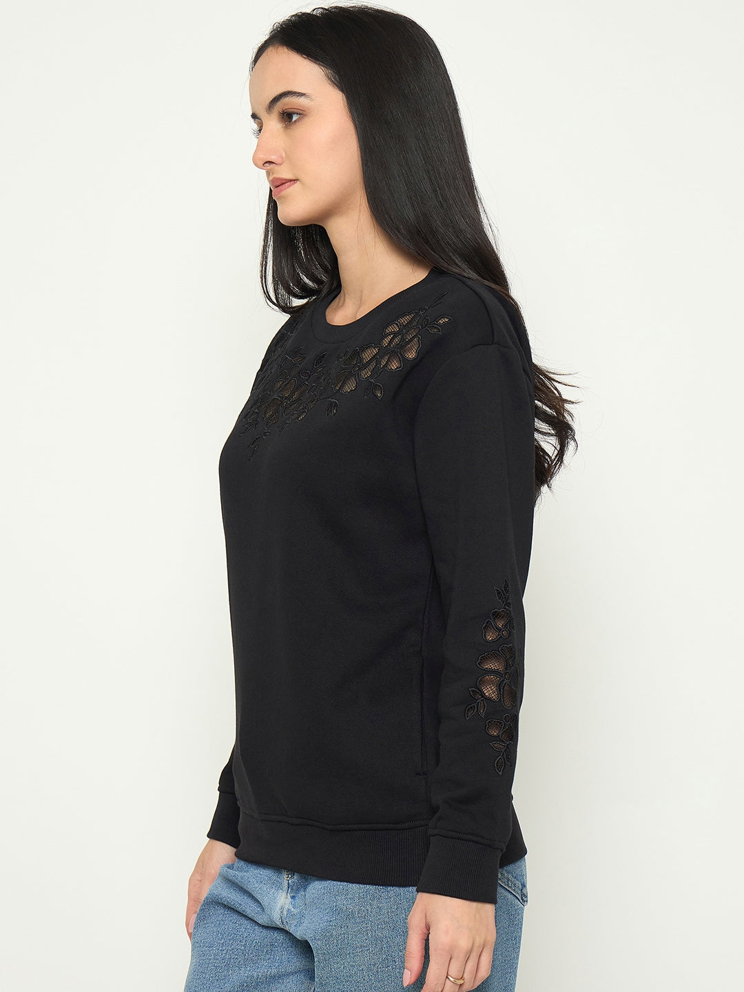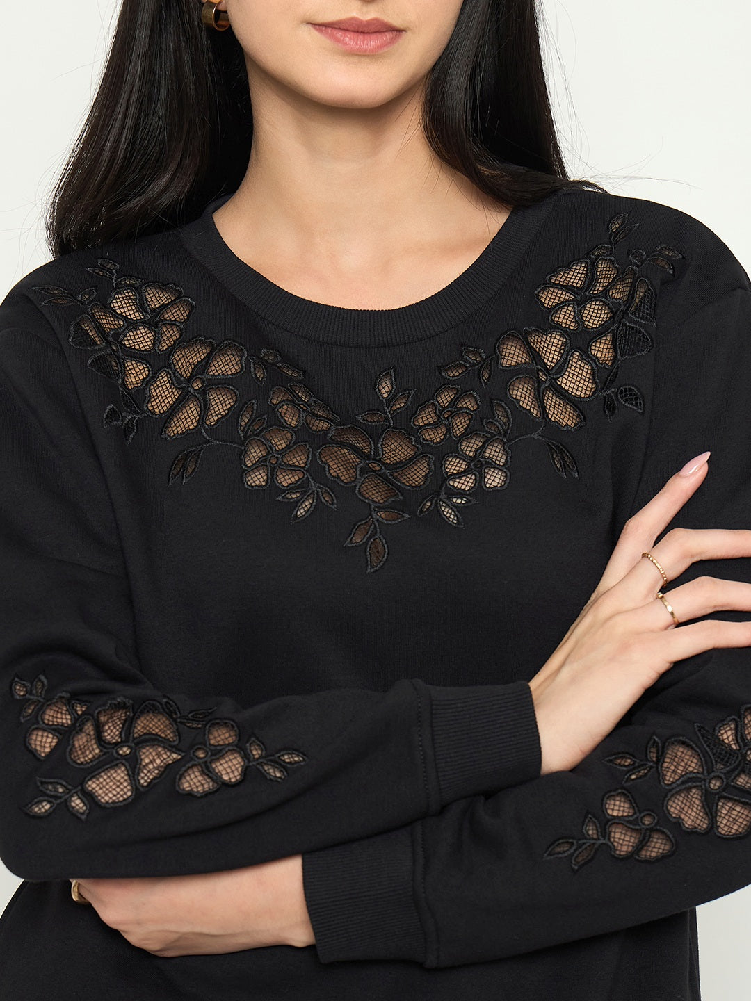 This regular-length sweatshirt features full sleeves and a classic round neckline for everyday comfort. Designed with intricate placement embroidery on the front and sleeves, it adds a refined touch to a casual essential. Finished with thoughtful detailing, this sweatshirt is perfect for effortless styling and all-day wear.