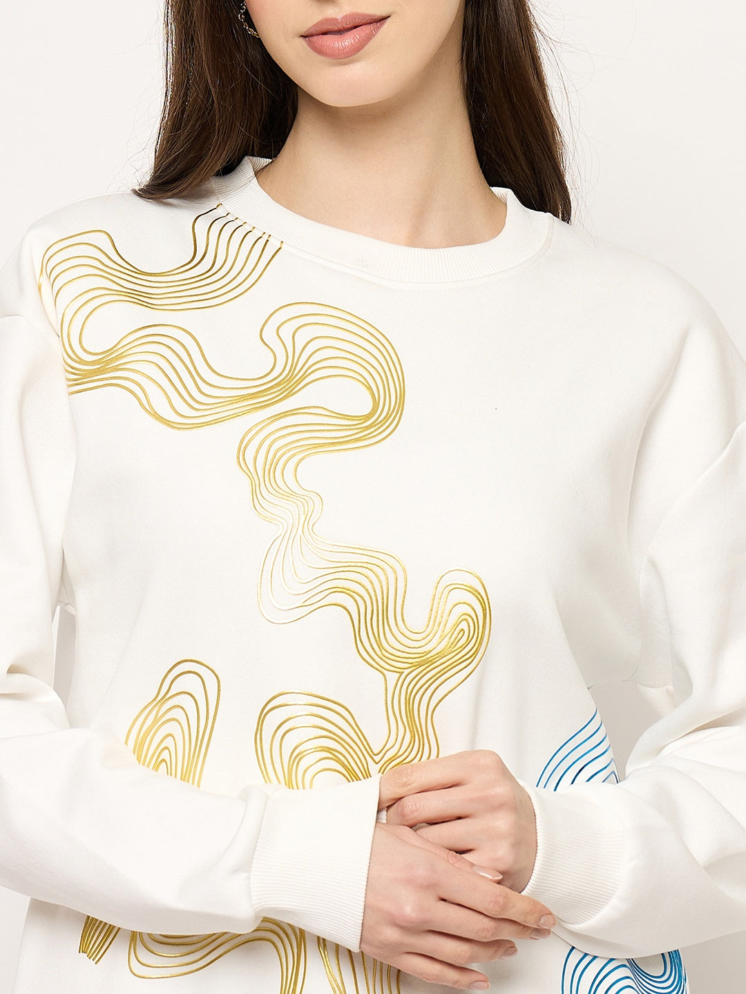 Elevate your casuals with this white printed crew neck sweater. Soft, stylish, and perfect for winter warmth with effortless chic.