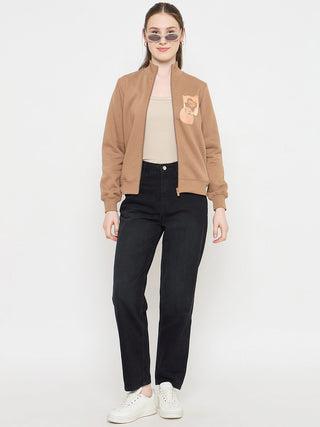 Madame Beige Mock Neck Sweatshirt with Graphic Print Pocket Patch