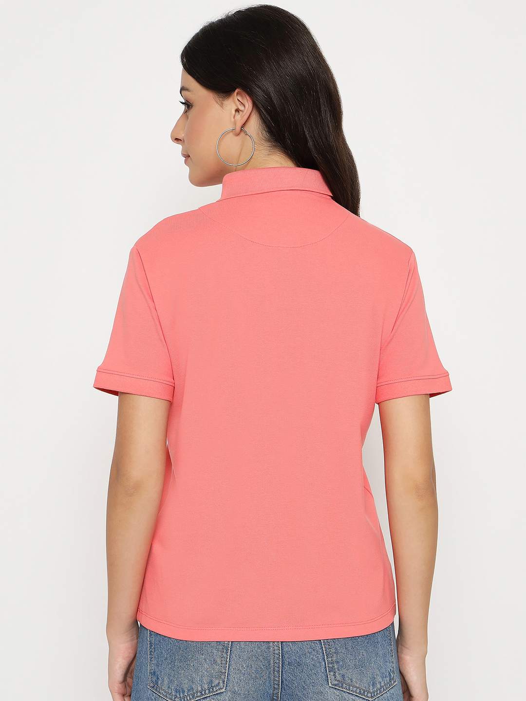 Madame Graphic Print Adorned Cotton Blend Coral Polo T-shirt