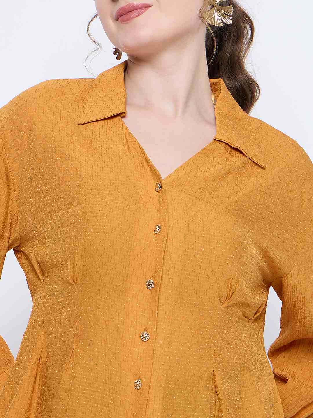 Madame Pleat Detailed Pearl Buttoned Solid Mustard Yellow Shirt
