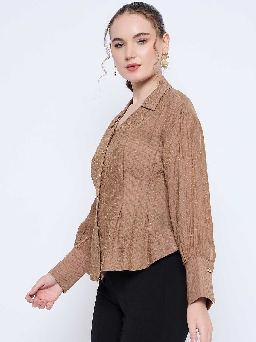 Madame Solid Tan Wing Neck Button Down Cuff Sleeve Shirt