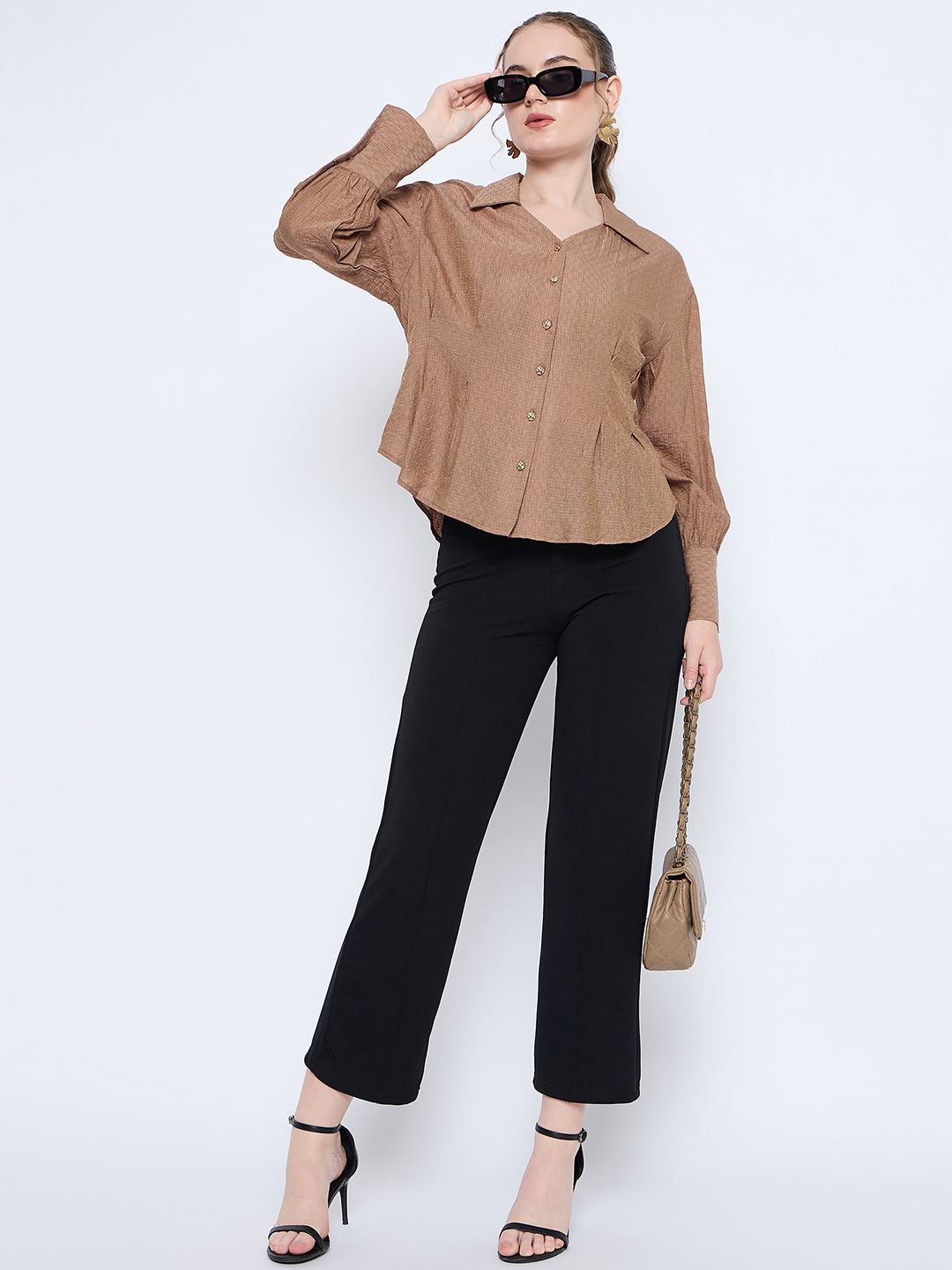 Stay ahead of the shirt game with the wing neck cuff sleeve shirt. This shirt features a unique wing neck design that adds a touch of elegance, making it suitable for both professional settings and laid-back outings. The solid tan color is versatile, allowing you to pair it effortlessly with jeans, skirts, or tailored trousers. It also offers a button-down front that adds a classic touch, and the cuff sleeves provide a refined finish that can be rolled up for a more relaxed vibe. The breathable material ensures you stay comfortable throughout the day, while the wing neck design sets you apart from the crowd.
