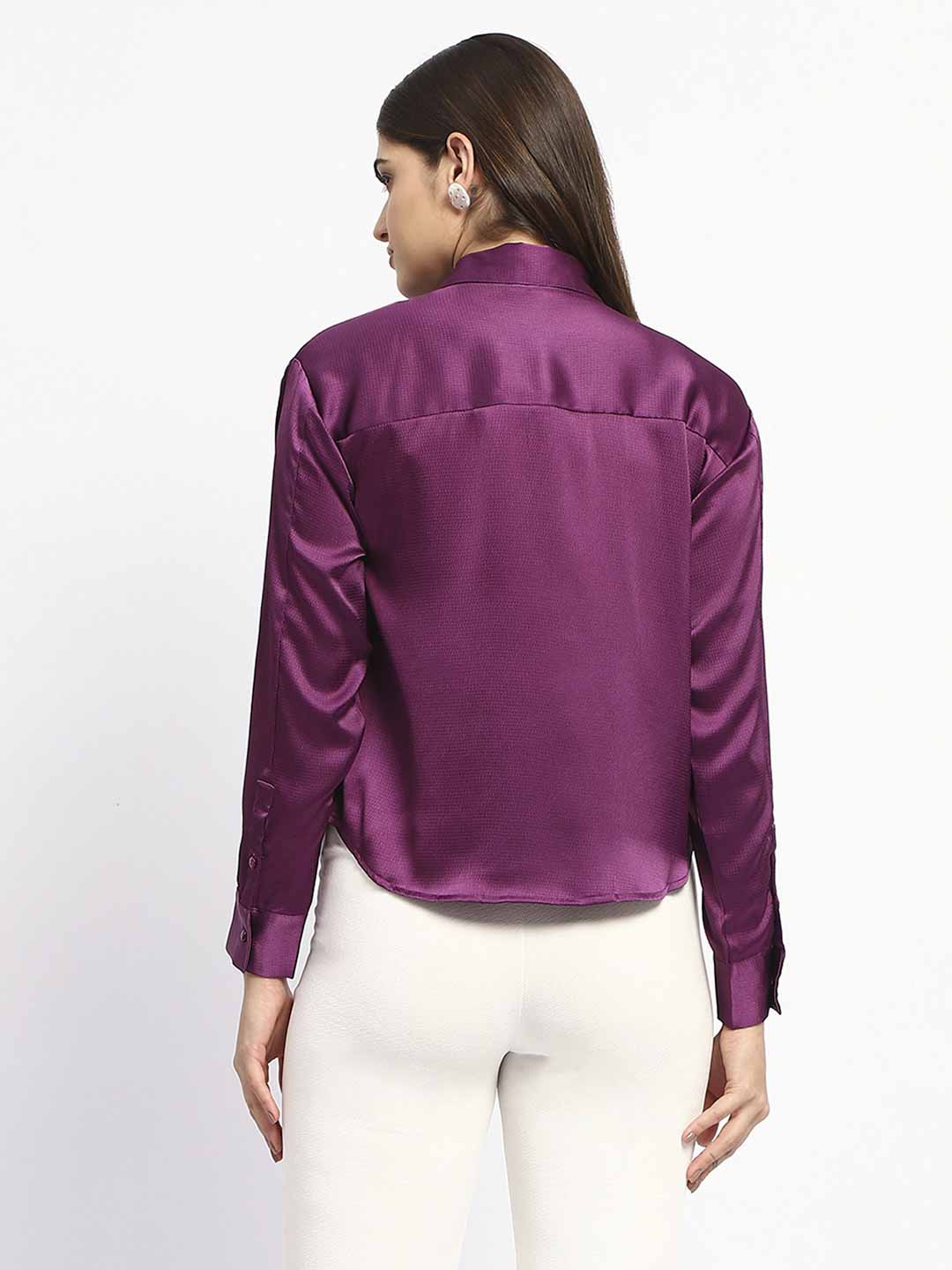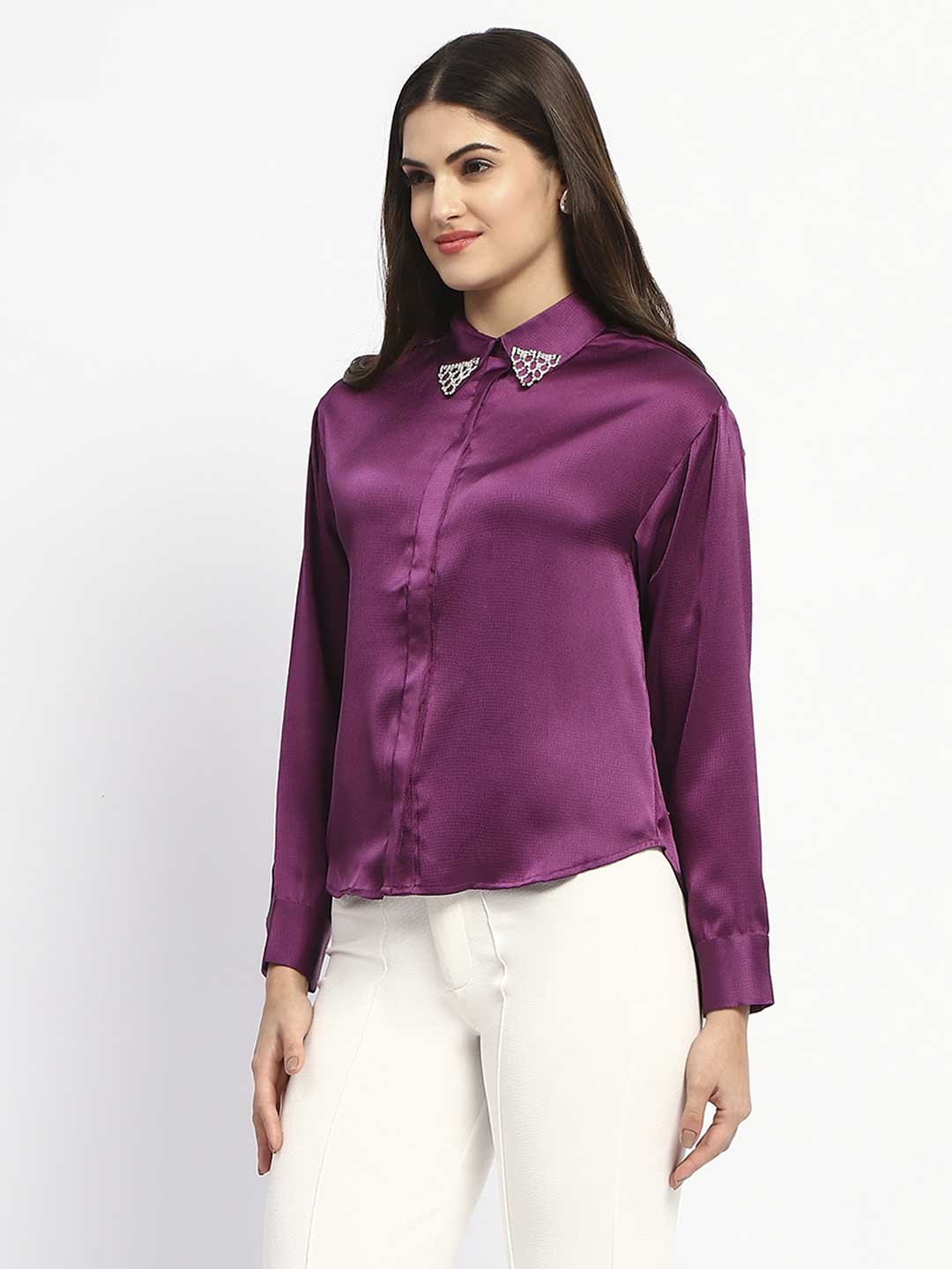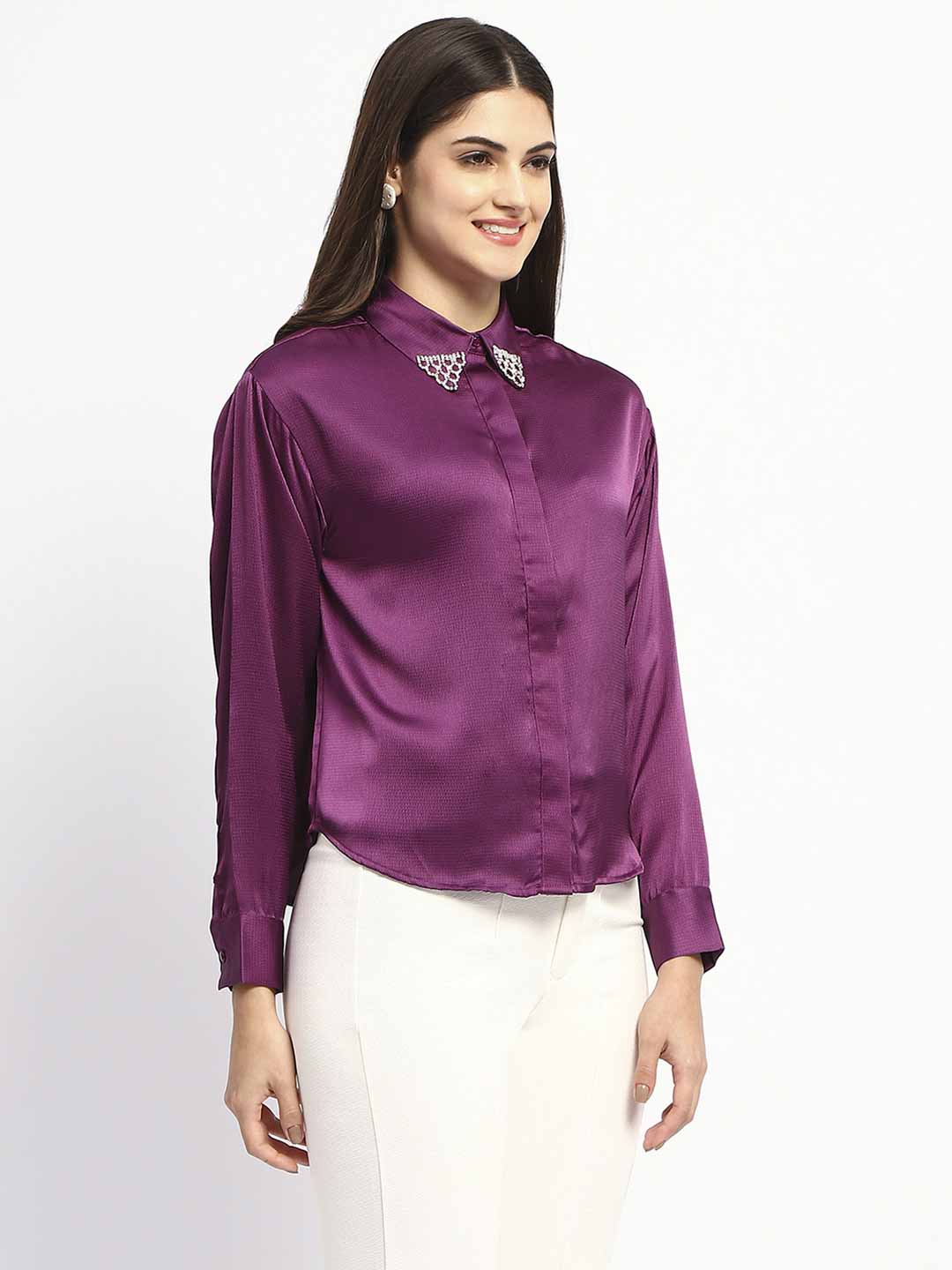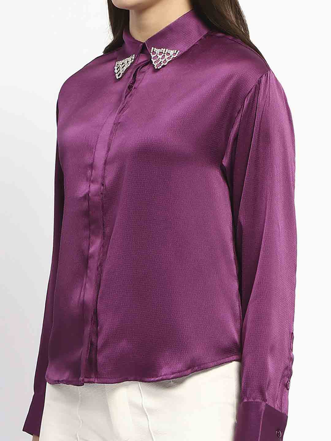 Madame Embellished Collar Cuff Sleeve Solid Purple Shirt