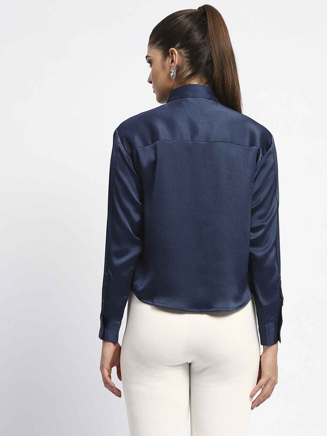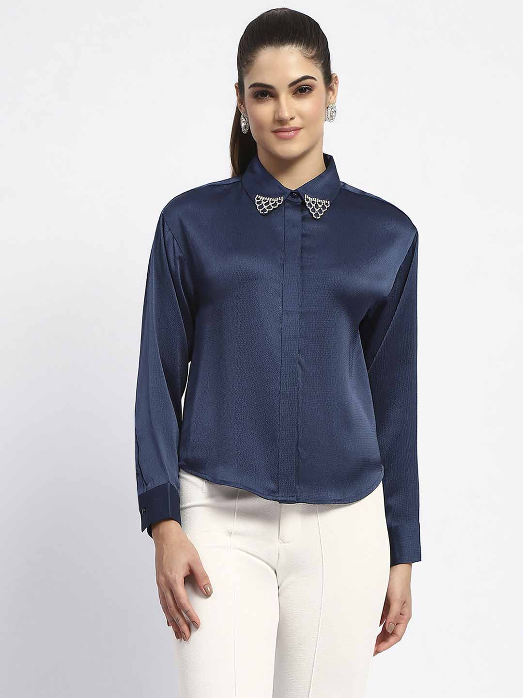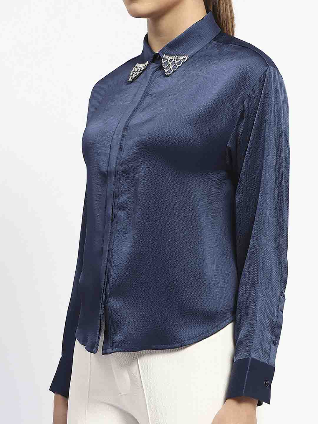 Madame Embellished Collar Cuff Sleeve Solid Teal Shirt