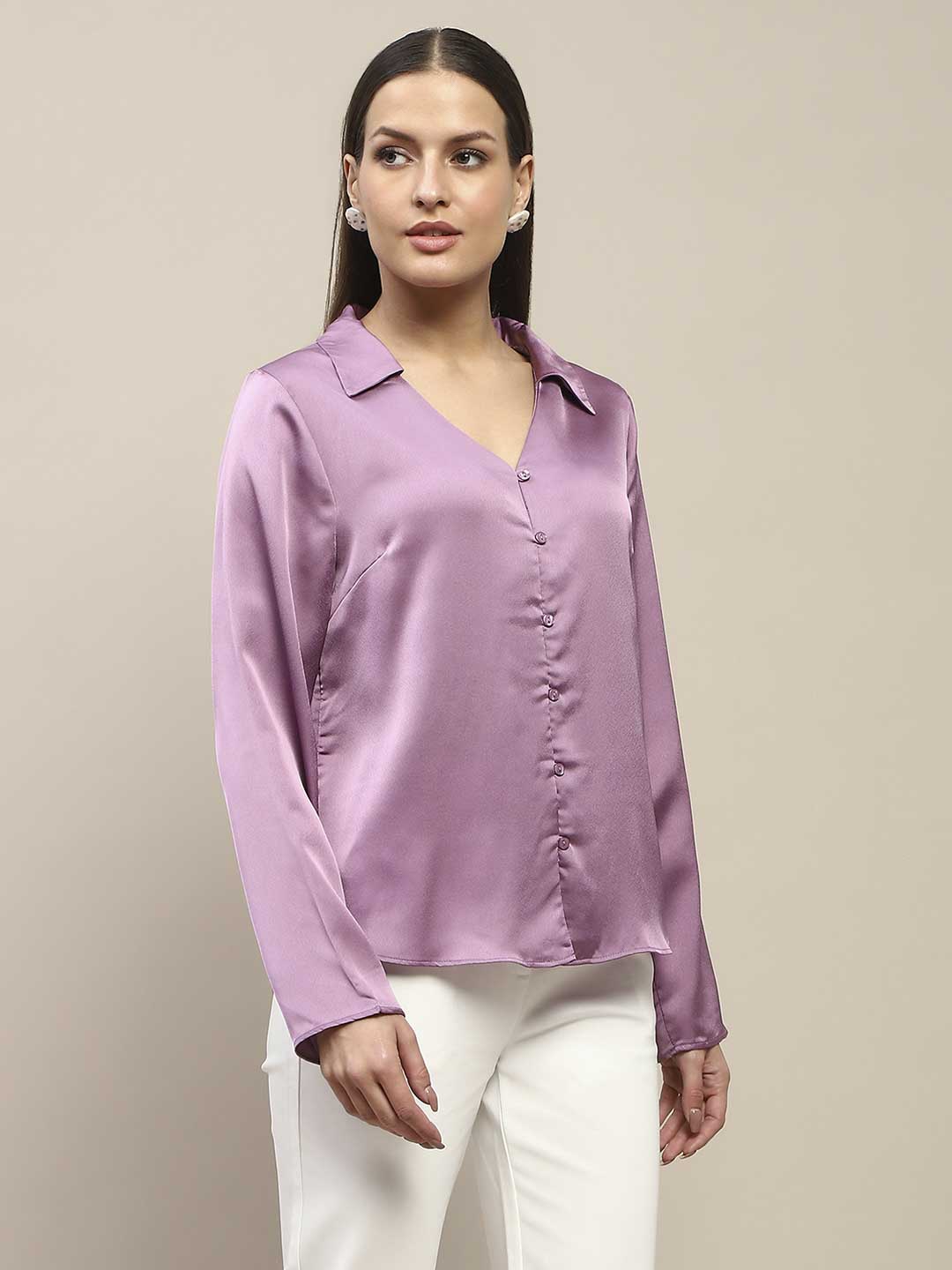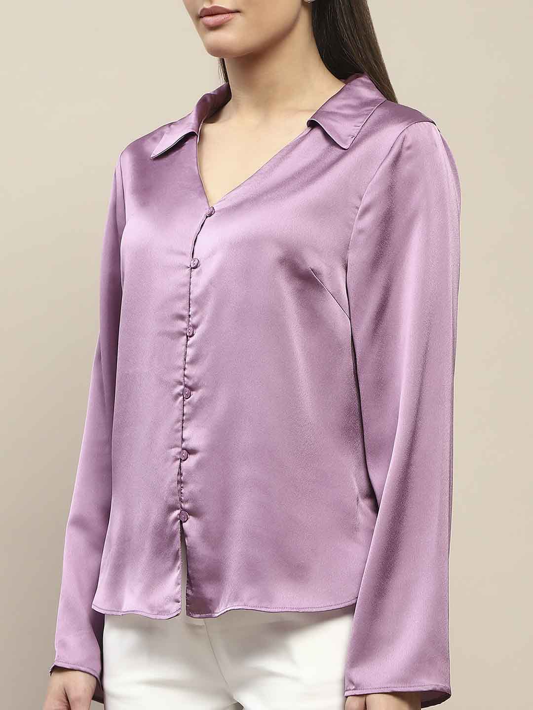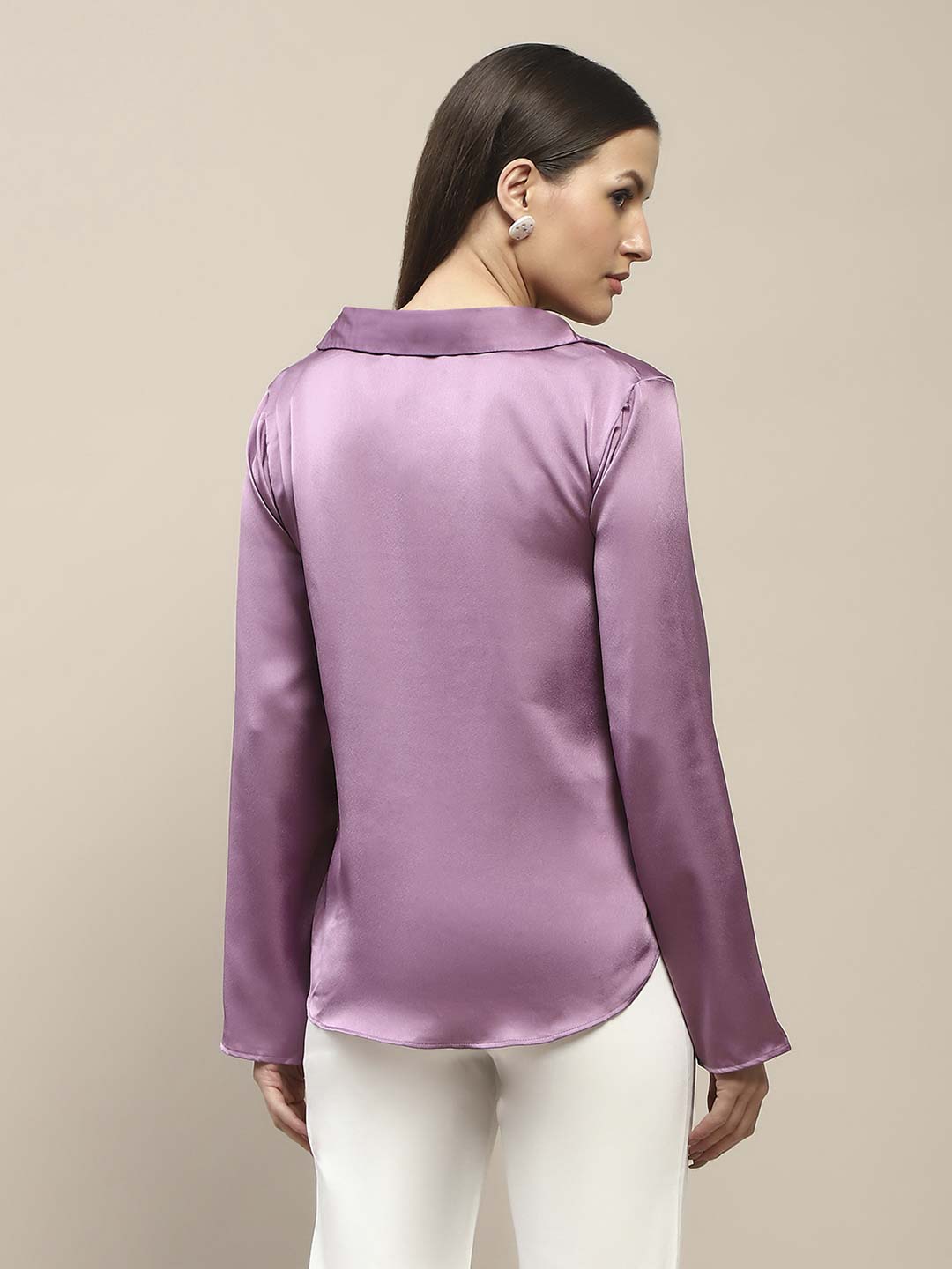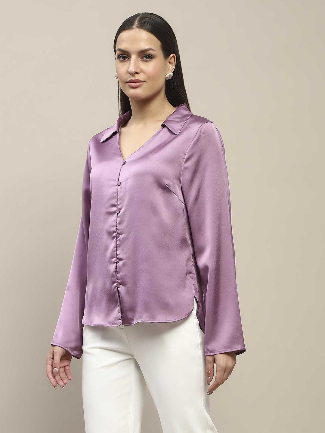 Madame Satin Bell Sleeve Collared Solid Lilac Top