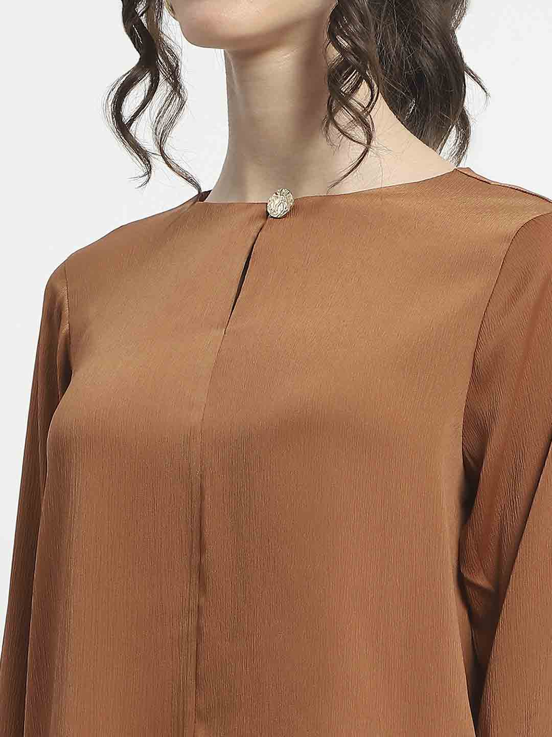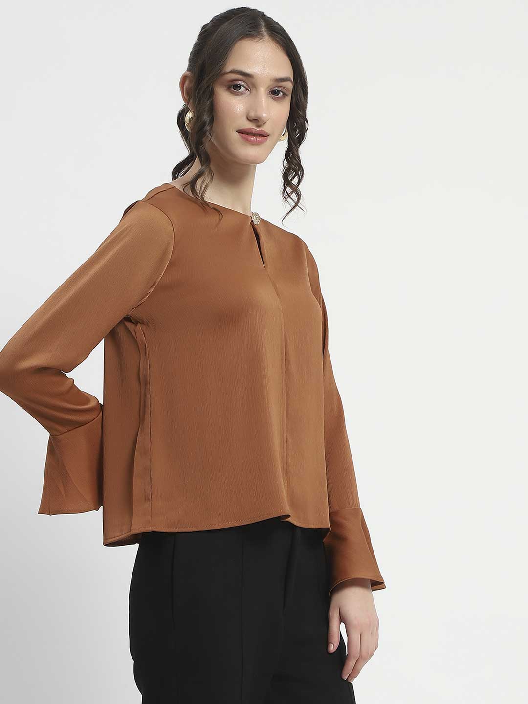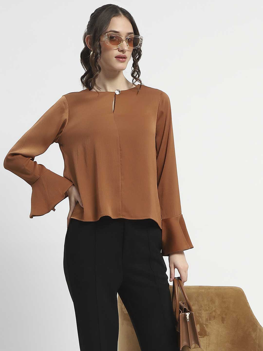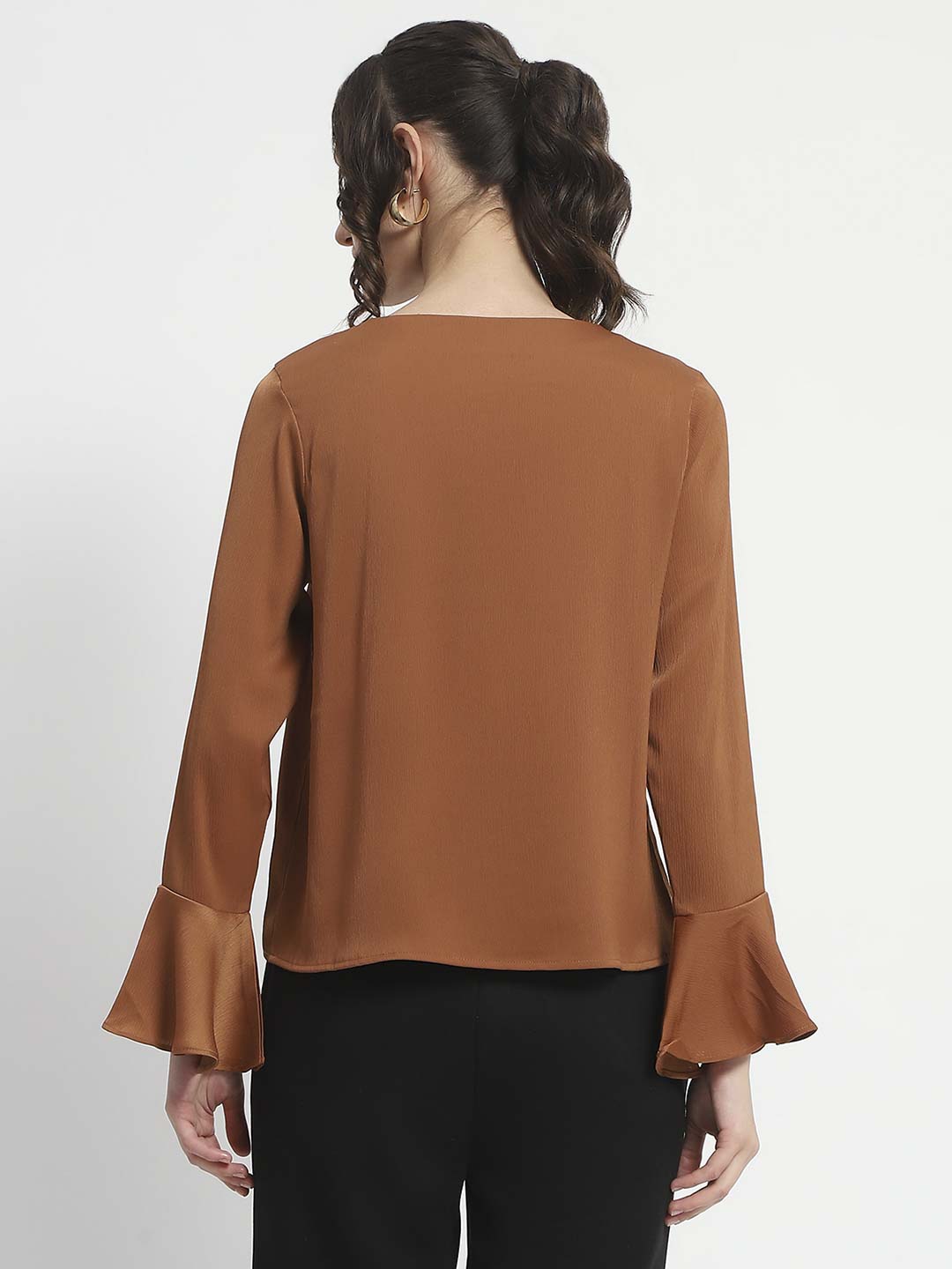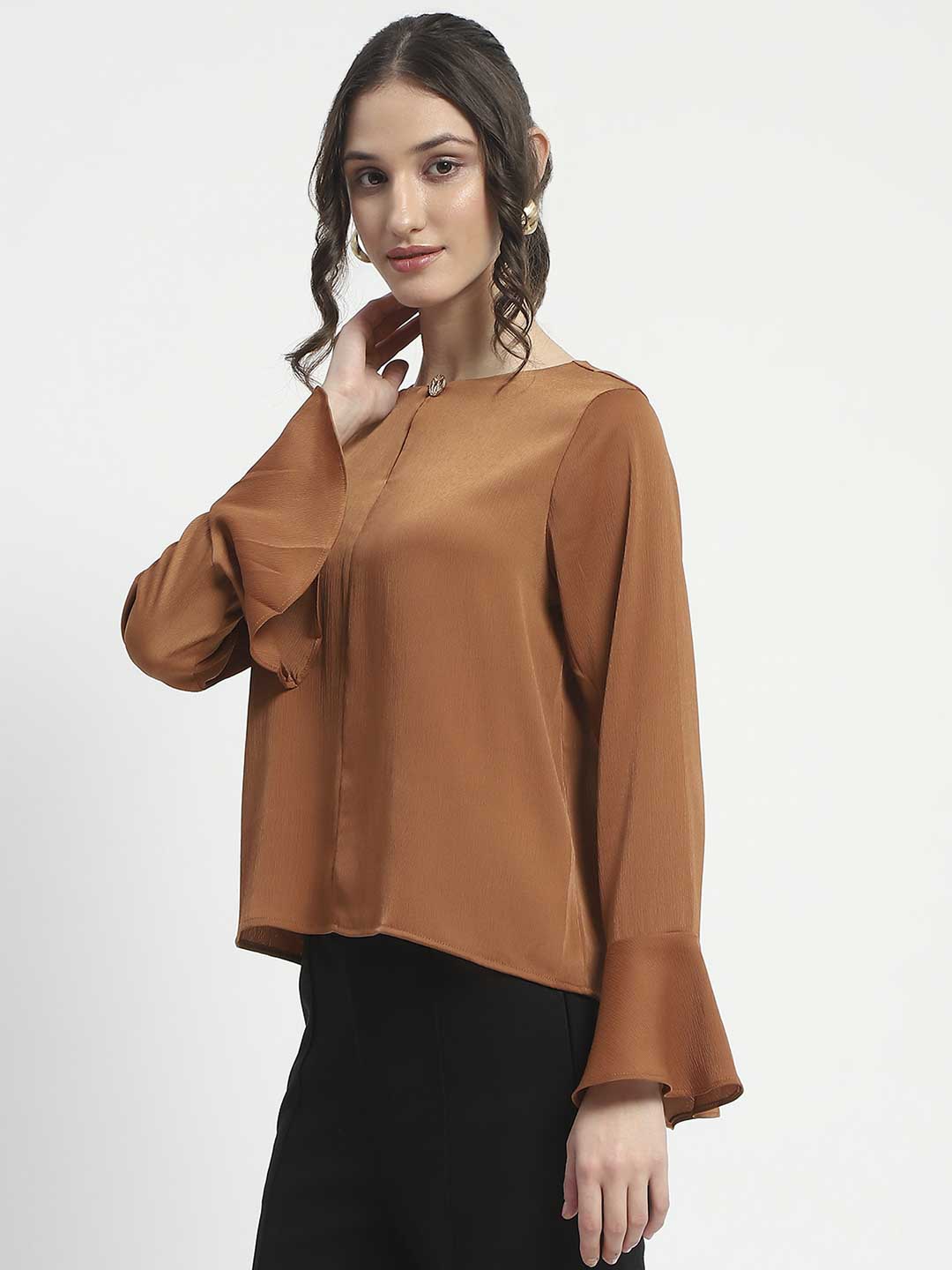 Madame Solid Golden Ruffle Sleeve Satin Top
