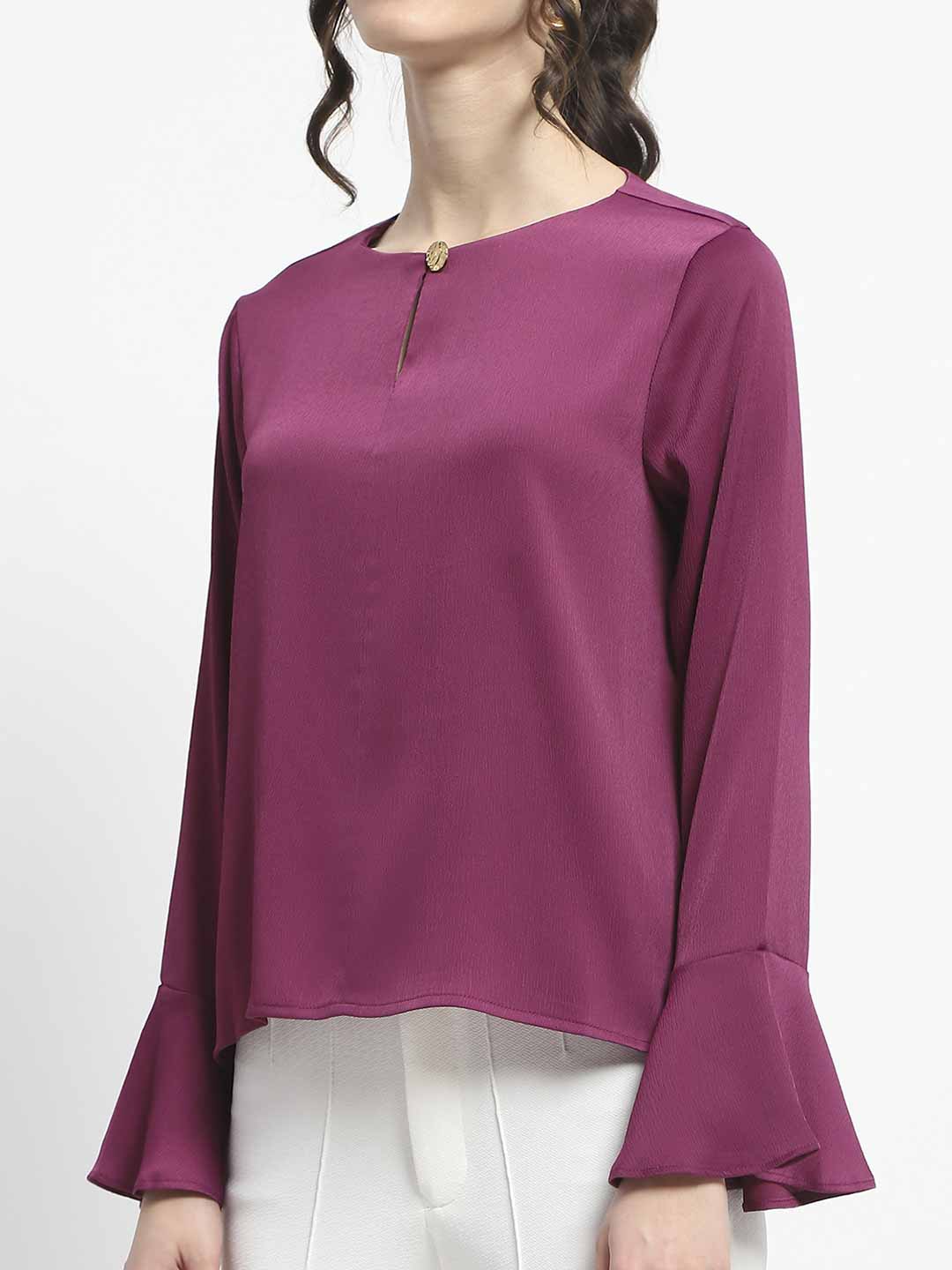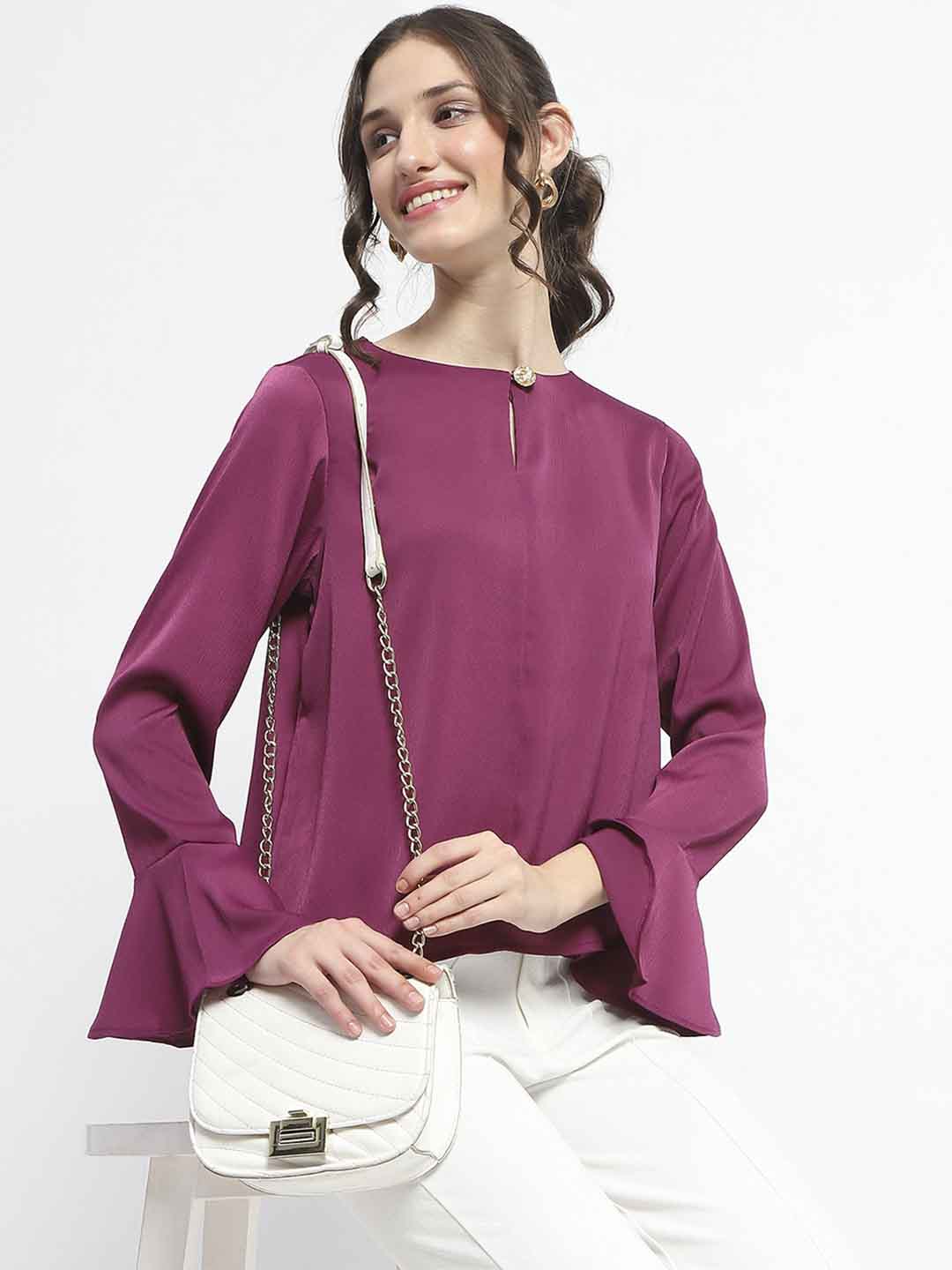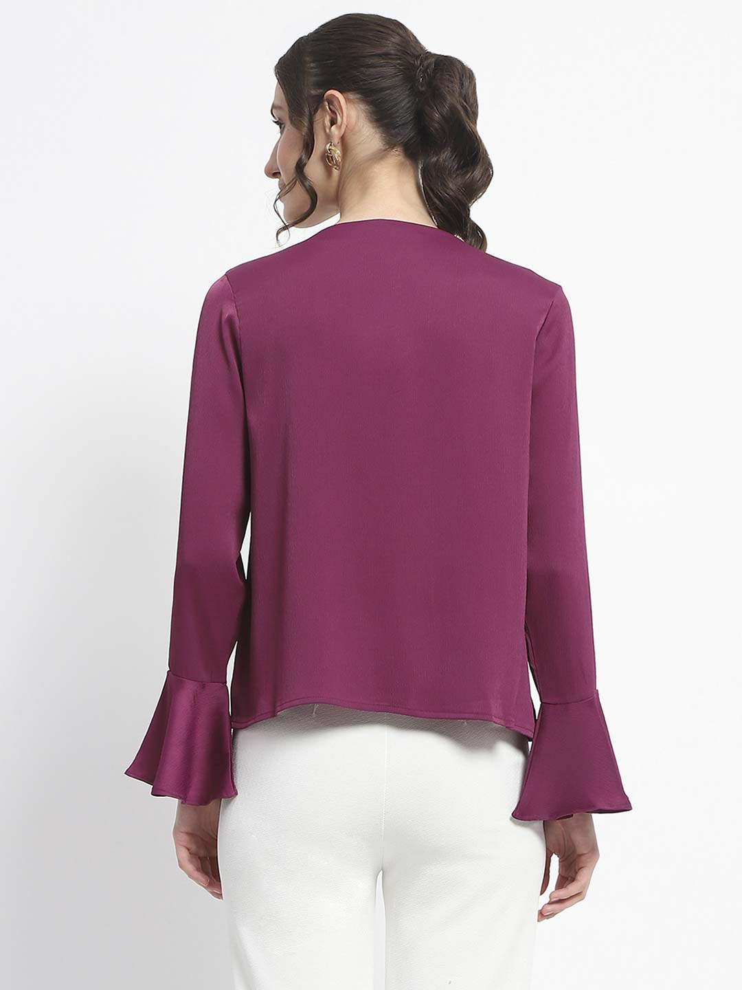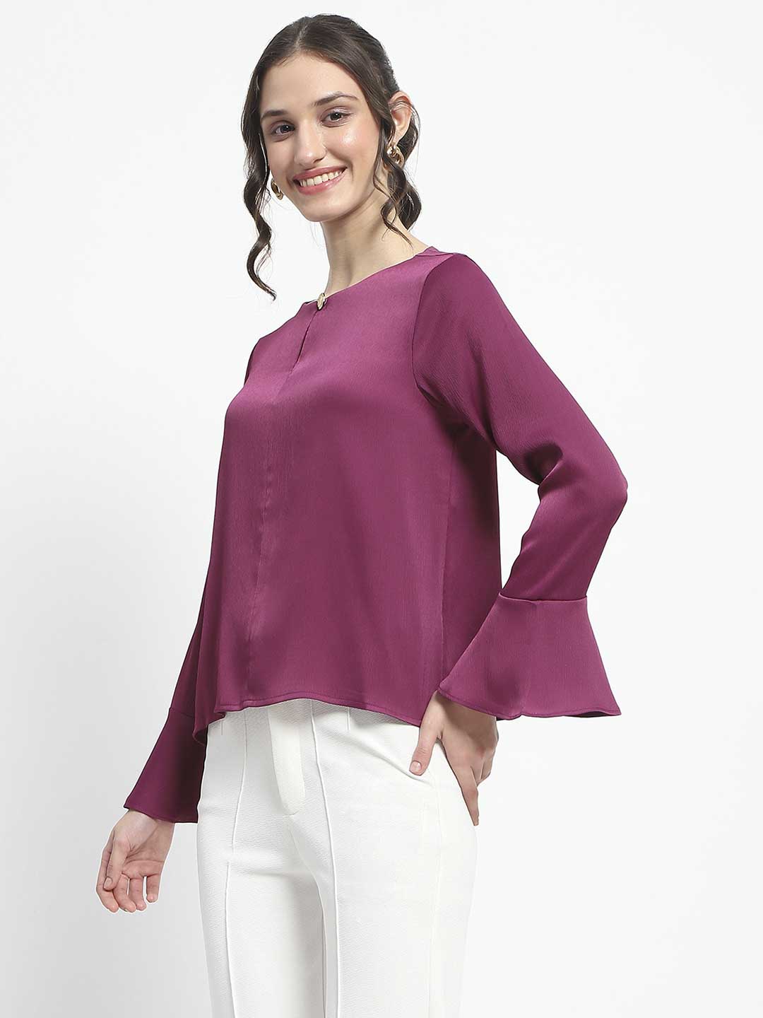 Madame Solid Plum Ruffle Sleeve Satin Top