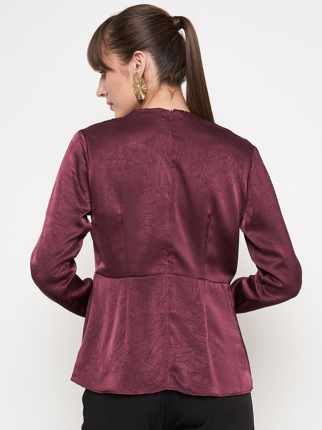 Madame Solid Maroon Overlap Asymmetrical Ruched Sleeve Satin Top