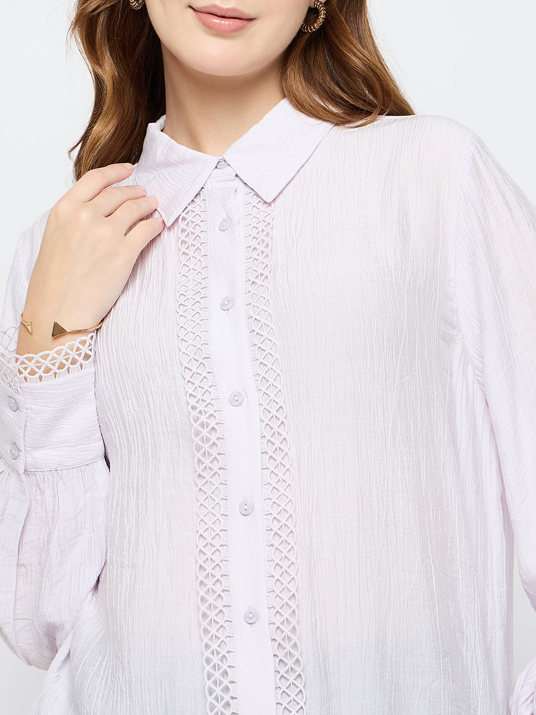 A serene lilac shirt in a smooth rayon blend adds a subtle pop of color to your fit. Perfect for casual office days or weekend brunches, it pairs with trousers or jeans for an easy look.