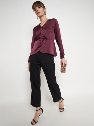 Madame Solid Maroon Overlap Asymmetrical Ruched Sleeve Satin Top
