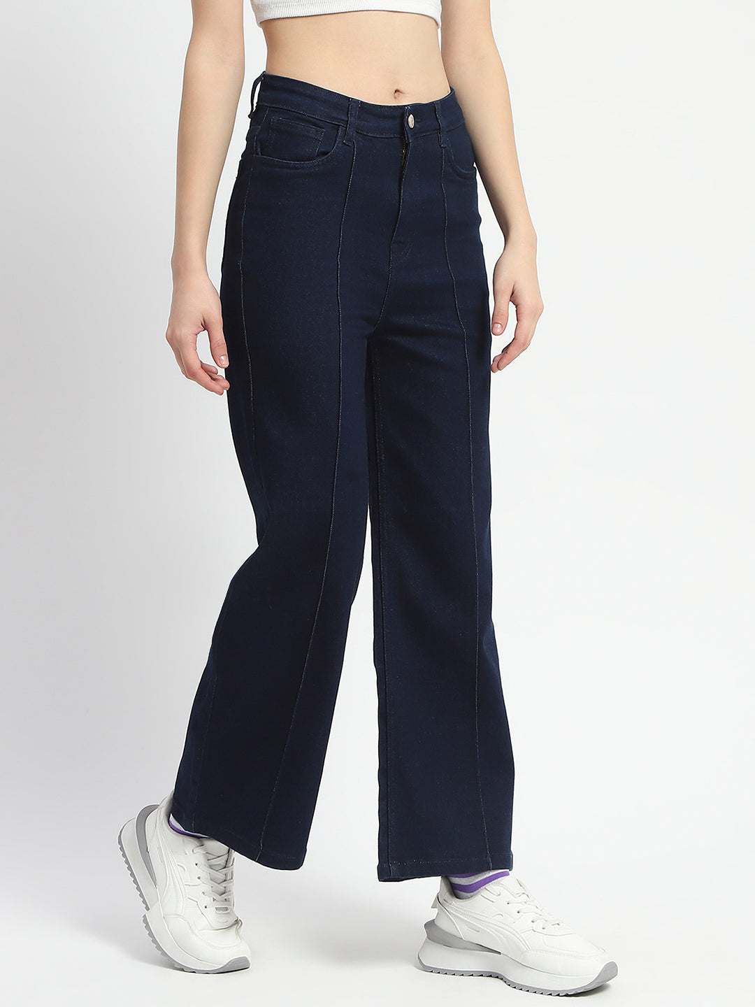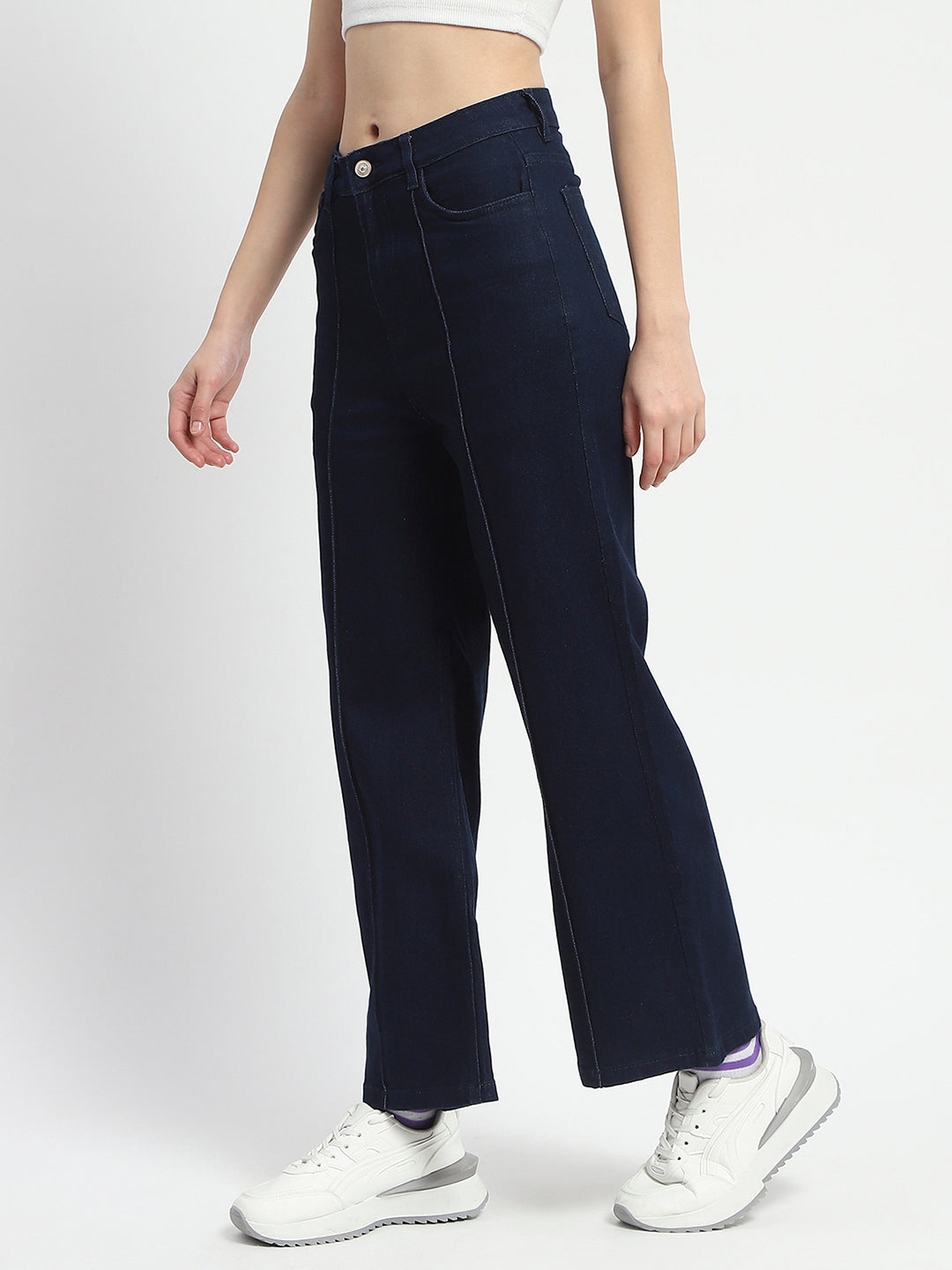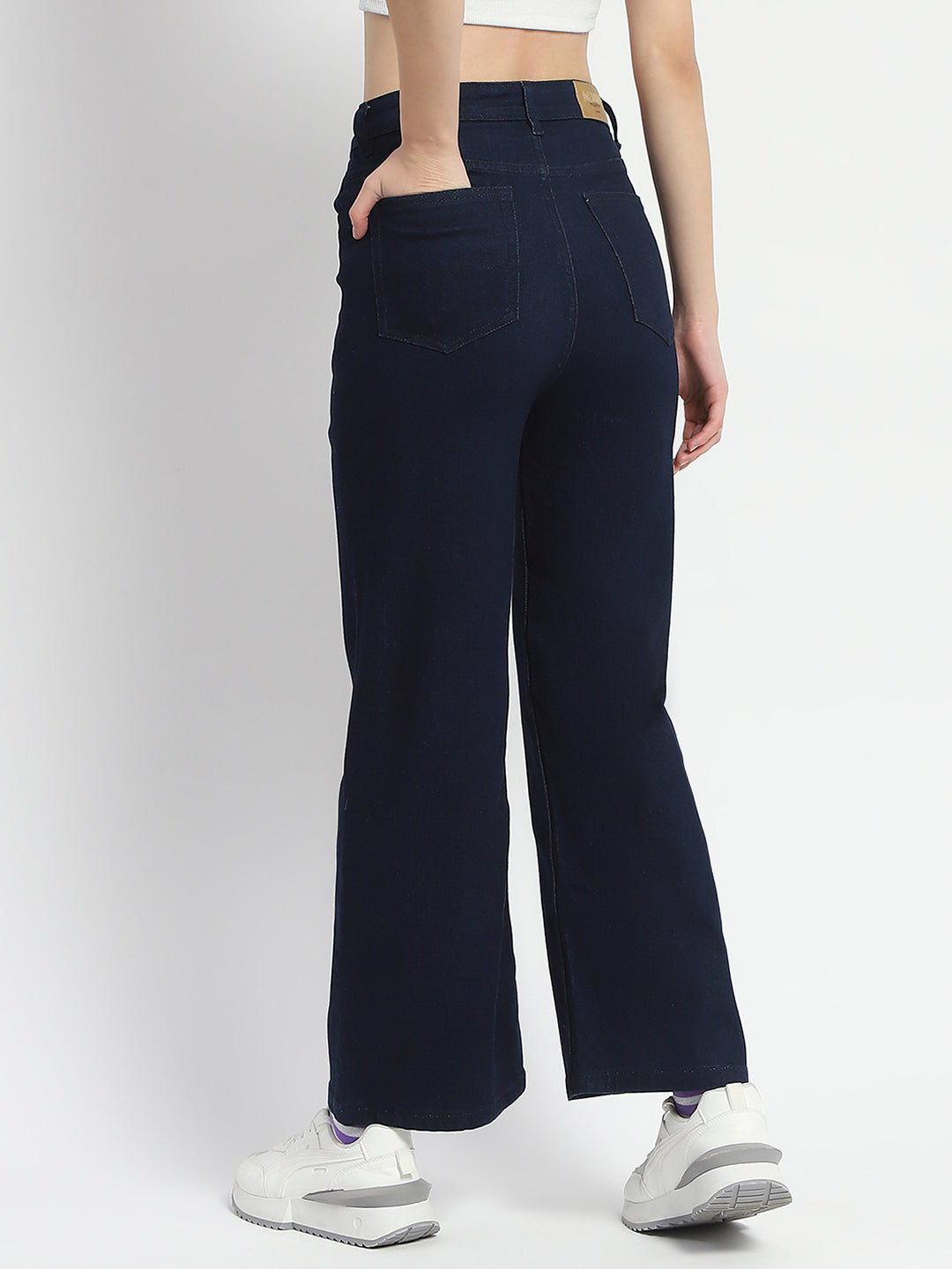 The rich dark blue hue adds a touch of sophistication, making them versatile enough. Crafted from a high-quality cotton blend, they offer a soft feel against the skin while providing the durability you expect from denim. The wide-leg cut not only enhances breathability but also creates a flattering silhouette that complements various body types, allowing you to move freely without sacrificing style. The mid-rise waist provides a comfortable fit that accentuates your natural shape.