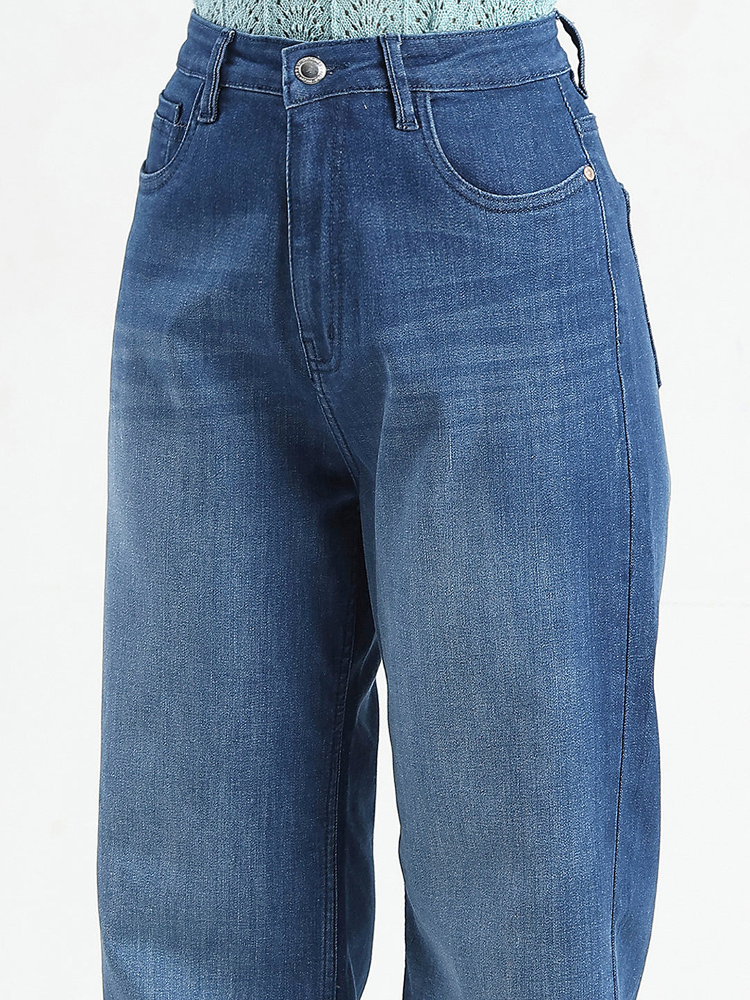 Wide-leg dark blue jeans with a stone-wash finish and subtle whiskering. Designed for a structured yet relaxed fit, making them a must-have for chic styling.