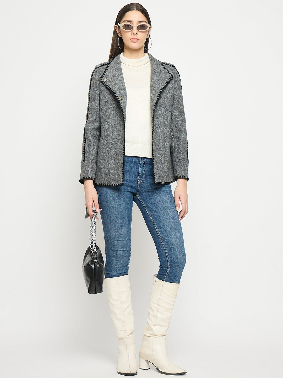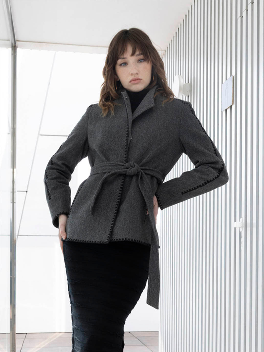Elegant winter staple: grey wrap-style coat with belt for a flattering fit. Chic, warm, and versatile for day-to-night style.