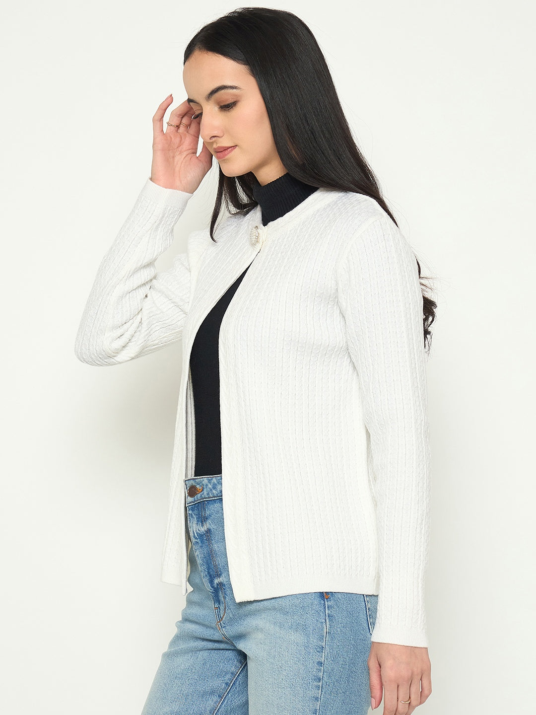 Elegant off-white cardigan with a single-button closure for a clean, refined look. Style it over a camisole with tailored trousers or jeans for effortless everyday sophistication.