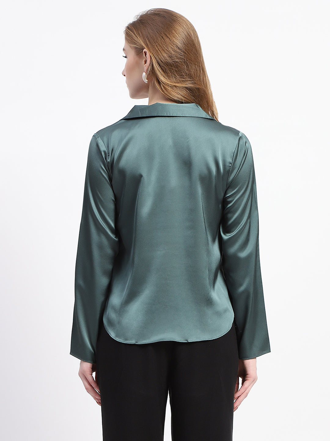 Madame Satin Bell Sleeve Collared Solid Jade Green Top