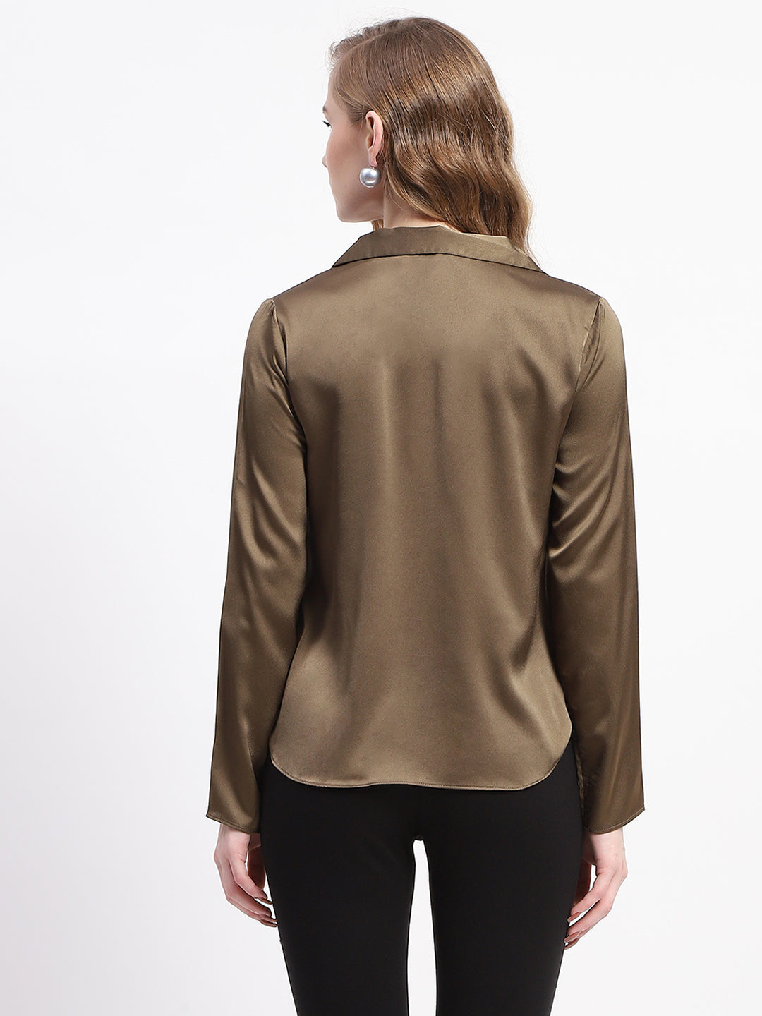 Made from a satin-like fabric, this top features a smooth, lustrous finish that adds a refined look to any outfit. The classic collar and long sleeves provide a tailored fit, making it perfect for professional settings or a stylish night out. The button-up front adds a sleek, minimalist appeal, while the rich olive green color offers a versatile option that complements various skin tones and pairs beautifully with both neutral and bold hues. This top ensures a comfortable yet elegant fit, enhancing your silhouette effortlessly. Perfect for pairing with skirts, trousers, or jeans, this timeless piece is a must-have for any fashion-forward wardrobe.