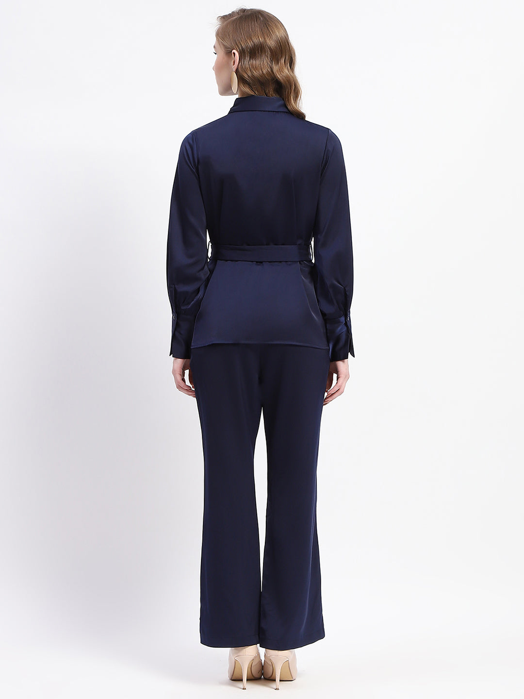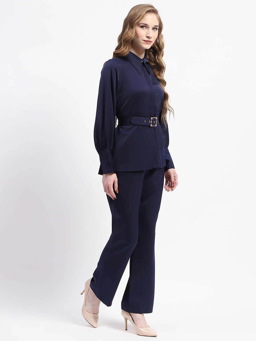 Madame Navy Belted Shirt and Wide-Leg Pants Co-ord Set