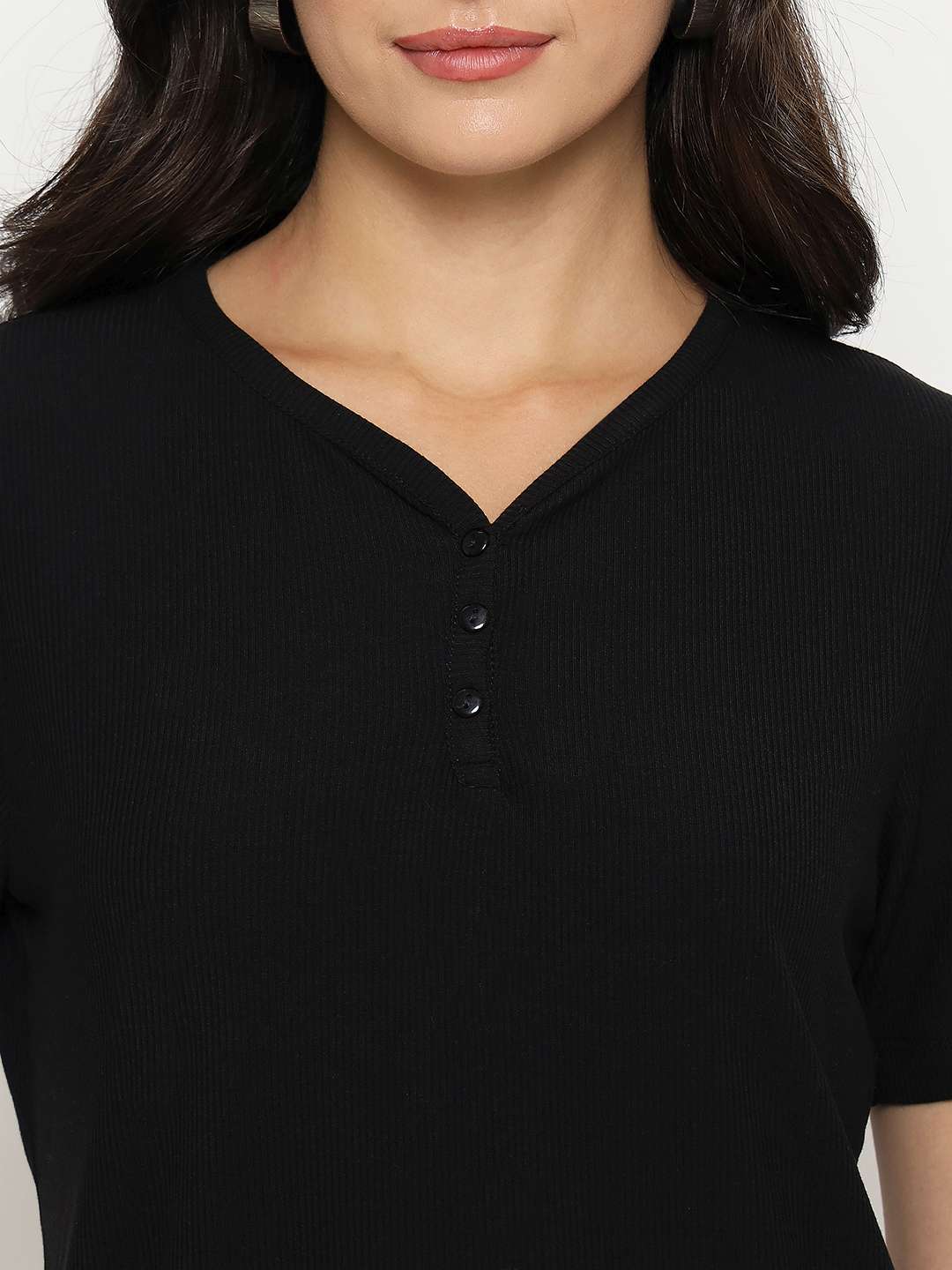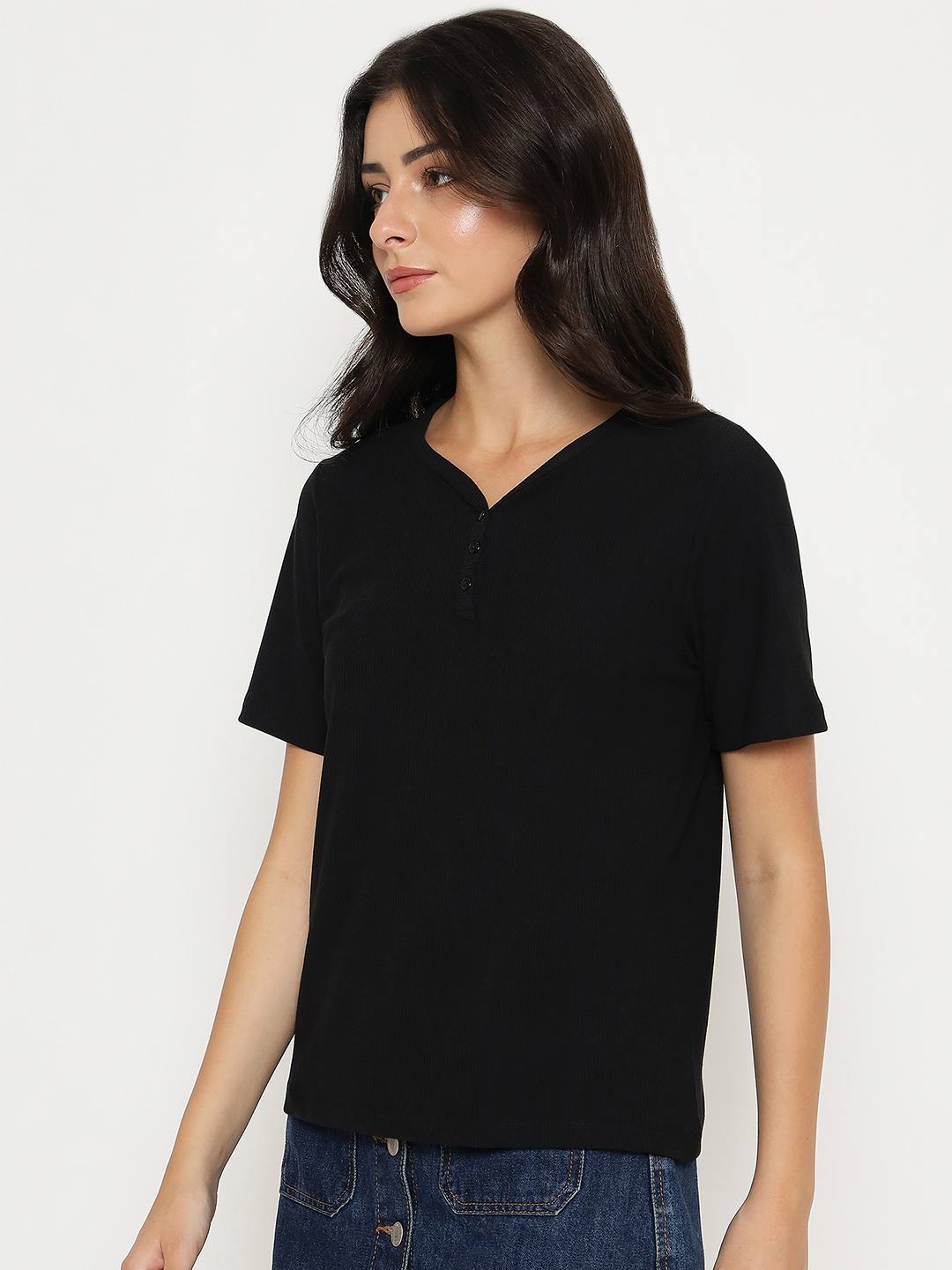 Simple yet sharp, this solid black tee features a classic Henley neckline for a touch of structure. Soft and versatile, ideal for casual outings or layering with jackets.