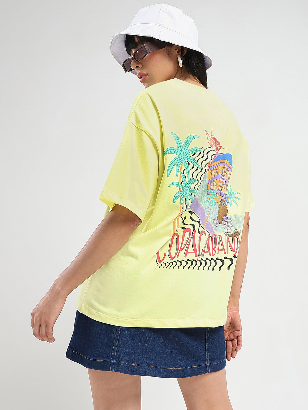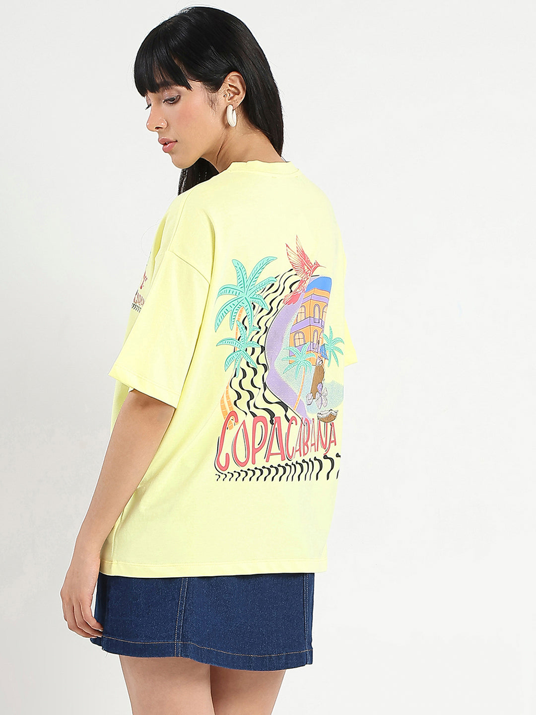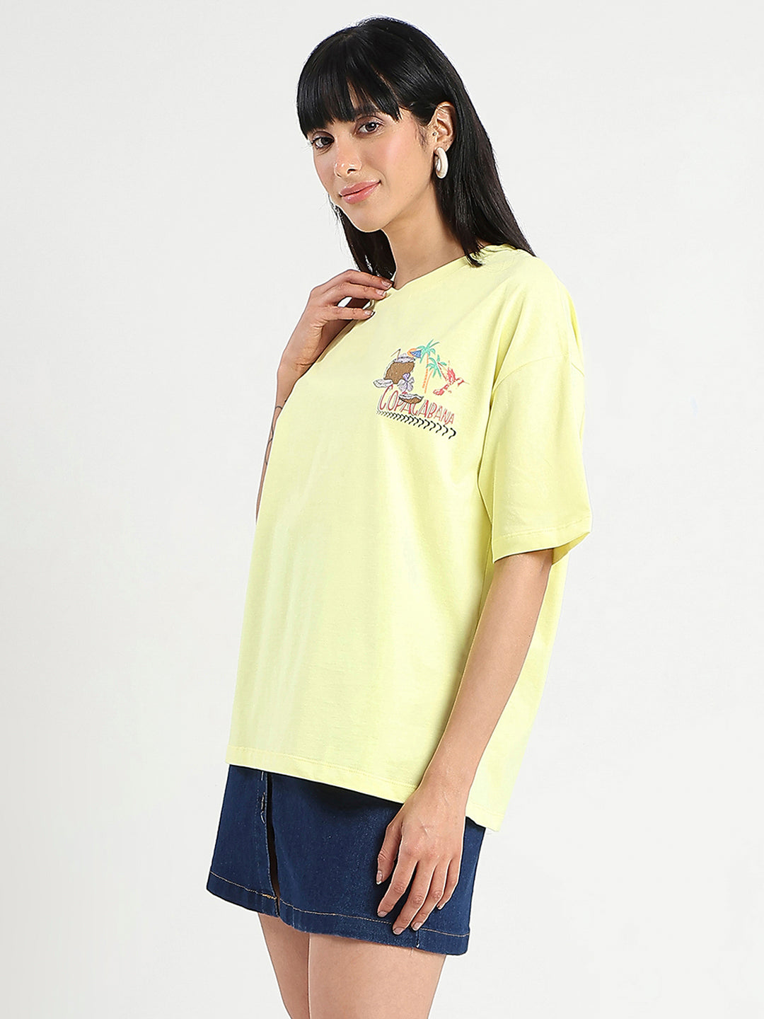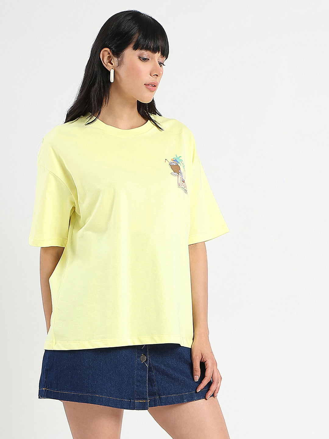 Featuring a small patch of graphic print on the t-shirt with a yellow base that makes the print stand out, this soft top is perfect for casual or vacation wear.
