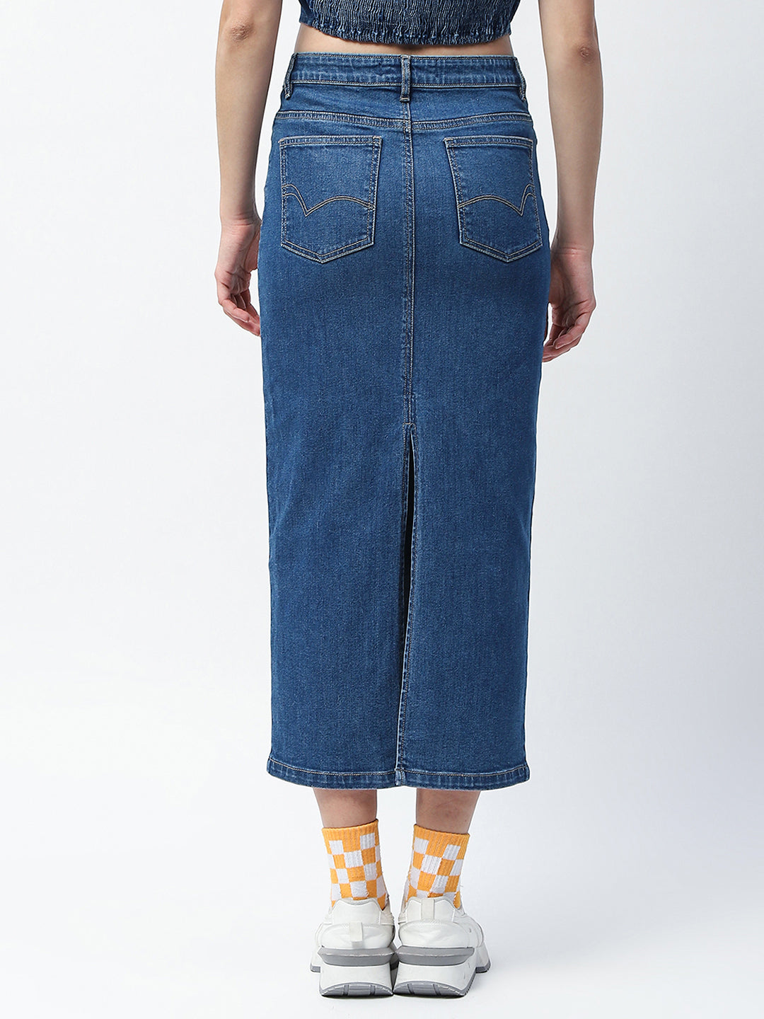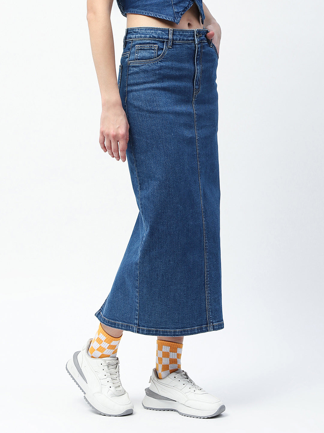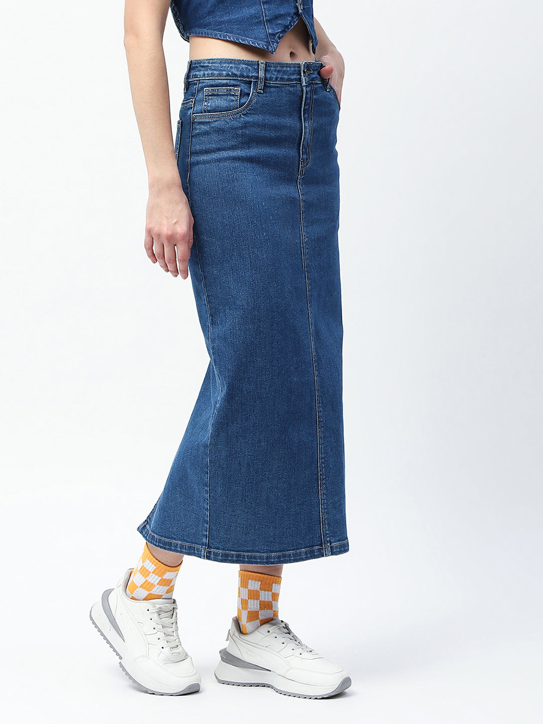 Madame Solid Mid Blue Cotton Blend Maxi Denim Skirt