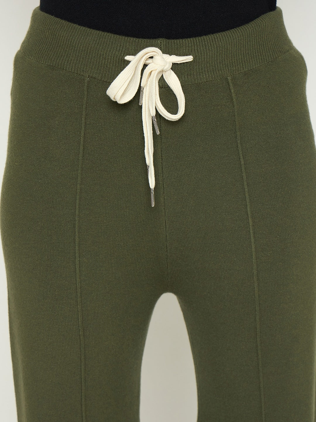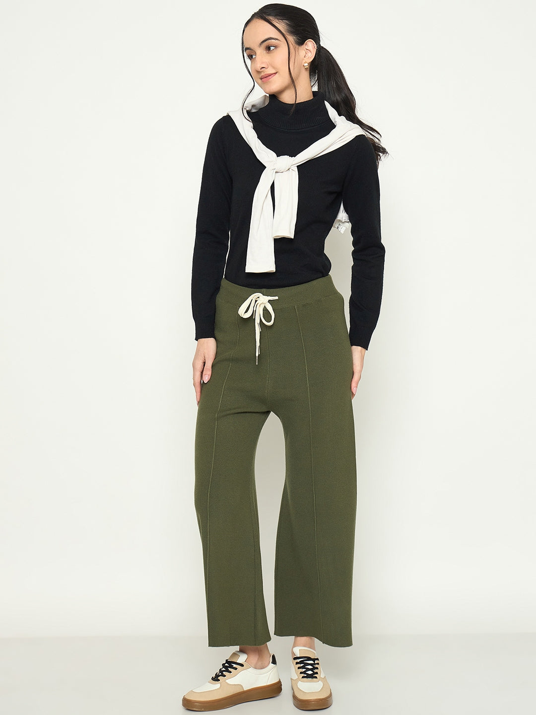 Madame olive green wide leg wool trousers with drawstring offer cozy warmth and relaxed style. Soft wool blend and easy fit make them perfect for comfortable, versatile looks all day.